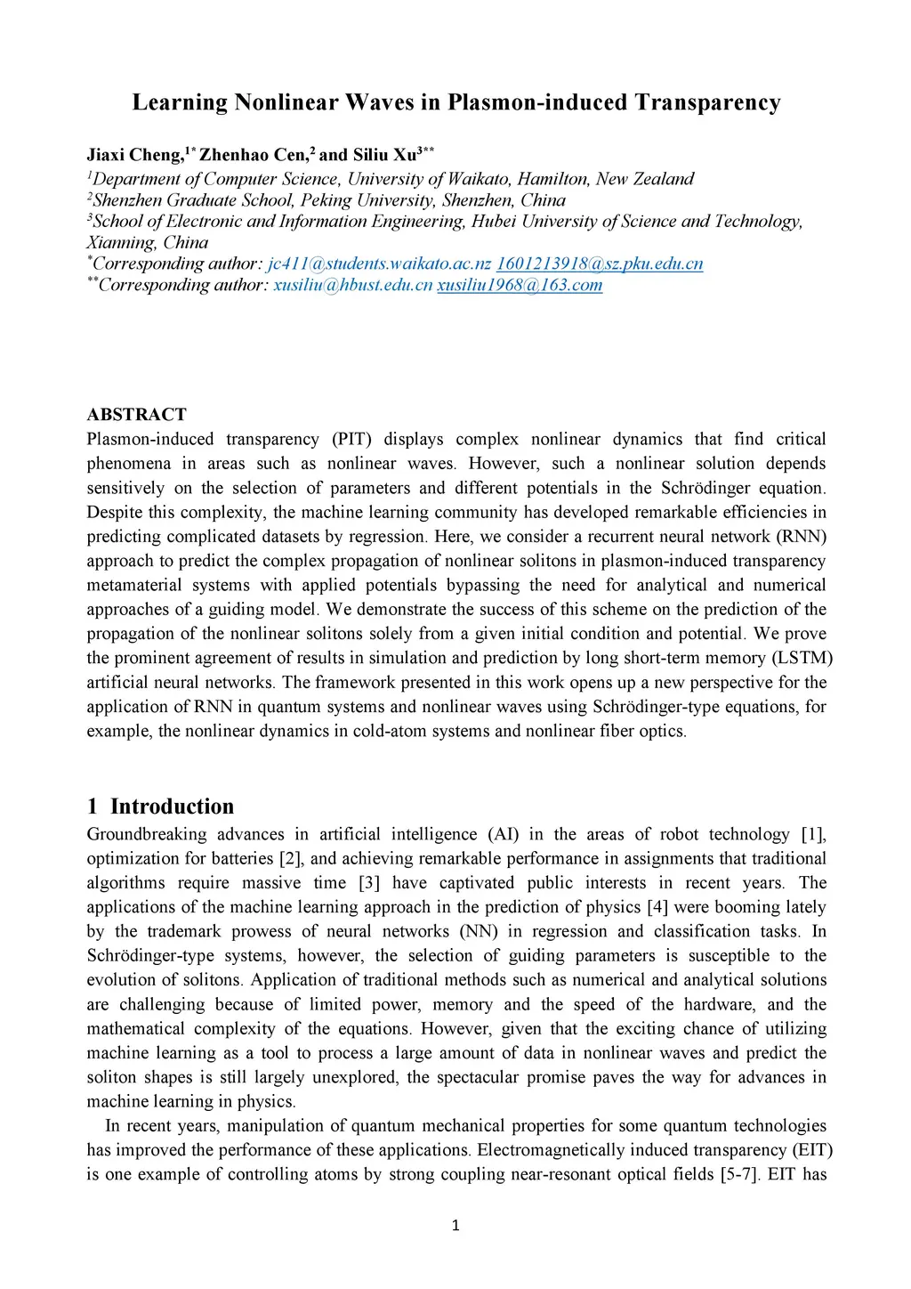 Plasmon-induced transparency (PIT) displays complex nonlinear dynamics that find critical phenomena in areas such as nonlinear waves. However, such a nonlinear solution depends sensitively on the selection of parameters and different potentials in the Schr\"odinger equation. Despite this complexity, the machine learning community has developed remarkable efficiencies in predicting complicated datasets by regression. Here, we consider a recurrent neural network (RNN) approach to predict the complex propagation of nonlinear solitons in plasmon-induced transparency metamaterial systems with applied potentials bypassing the need for analytical and numerical approaches of a guiding model. We demonstrate the success of this scheme on the prediction of the propagation of the nonlinear solitons solely from a given initial condition and potential. We prove the prominent agreement of results in simulation and prediction by long short-term memory (LSTM) artificial neural networks. The framework presented in this work opens up a new perspective for the application of RNN in quantum systems and nonlinear waves using Schr\"odinger-type equations, for example, the nonlinear dynamics in cold-atom systems and nonlinear fiber optics.