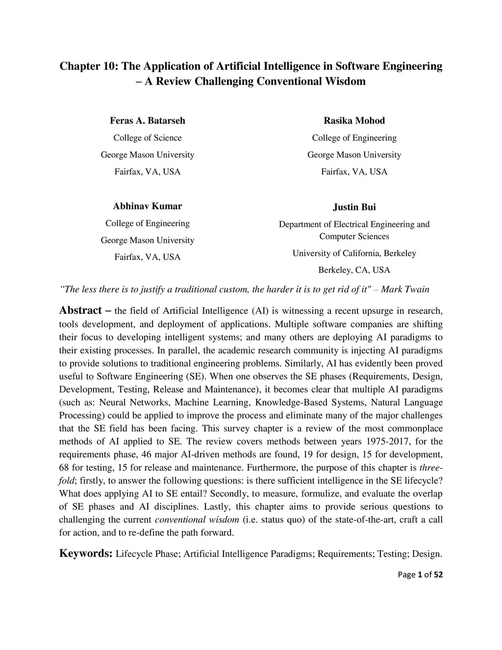 The field of artificial intelligence (AI) is witnessing a recent upsurge in research, tools development, and deployment of applications. Multiple software companies are shifting their focus to developing intelligent systems; and many others are deploying AI paradigms to their existing processes. In parallel, the academic research community is injecting AI paradigms to provide solutions to traditional engineering problems. Similarly, AI has evidently been proved useful to software engineering (SE). When one observes the SE phases (requirements, design, development, testing, release, and maintenance), it becomes clear that multiple AI paradigms (such as neural networks, machine learning, knowledge-based systems, natural language processing) could be applied to improve the process and eliminate many of the major challenges that the SE field has been facing. This survey chapter is a review of the most commonplace methods of AI applied to SE. The review covers methods between years 1975-2017, for the requirements phase, 46 major AI-driven methods are found, 19 for design, 15 for development, 68 for testing, and 15 for release and maintenance. Furthermore, the purpose of this chapter is threefold; firstly, to answer the following questions: is there sufficient intelligence in the SE lifecycle? What does applying AI to SE entail? Secondly, to measure, formulize, and evaluate the overlap of SE phases and AI disciplines. Lastly, this chapter aims to provide serious questions to challenging the current conventional wisdom (i.e., status quo) of the state-of-the-art, craft a call for action, and to redefine the path forward.
