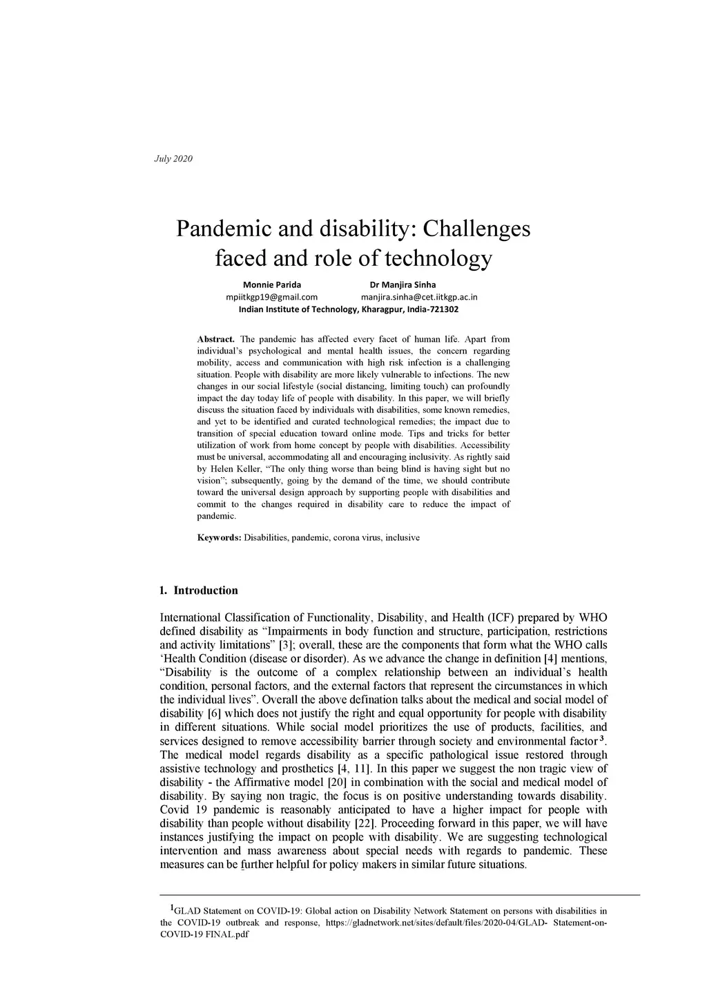 The pandemic has affected every facet of human life. Apart from individuals psychological and mental health issues, the concern regarding mobility, access and communication with high risk infection is a challenging situation. People with disability are more likely vulnerable to infections. The new changes in our social lifestyle (social distancing, limiting touch) can profoundly impact the day today life of people with disability. In this paper, we will briefly discuss the situation faced by individuals with disabilities, some known remedies, and yet to be identified and curated technological remedies; the impact due to transition of special education toward online mode. Tips and tricks for better utilization of work from home concept by people with disabilities. Accessibility must be universal, accommodating all and encouraging inclusivity. As rightly said by Helen Keller, 'The only thing worse than being blind is having sight but no vision'; subsequently, going by the demand of the time, we should contribute toward the universal design approach by supporting people with disabilities and commit to the changes required in disability care to reduce the impact of pandemic. Keywords: Disabilities, pandemic, corona virus, inclusive
