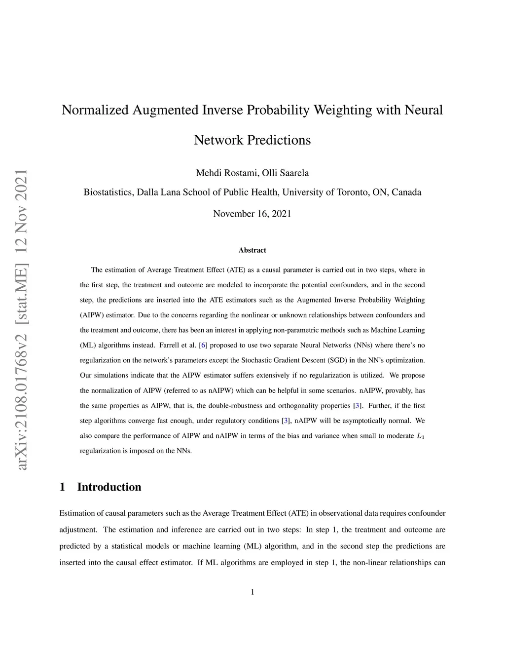 The estimation of Average Treatment Effect (ATE) as a causal parameter is carried out in two steps, where in the first step, the treatment and outcome are modeled to incorporate the potential confounders, and in the second step, the predictions are inserted into the ATE estimators such as the Augmented Inverse Probability Weighting (AIPW) estimator. Due to the concerns regarding the nonlinear or unknown relationships between confounders and the treatment and outcome, there has been an interest in applying non-parametric methods such as Machine Learning (ML) algorithms instead. Some literature proposes to use two separate Neural Networks (NNs) where there's no regularization on the network's parameters except the Stochastic Gradient Descent (SGD) in the NN's optimization. Our simulations indicate that the AIPW estimator suffers extensively if no regularization is utilized. We propose the normalization of AIPW (referred to as nAIPW) which can be helpful in some scenarios. nAIPW, provably, has the same properties as AIPW, that is, the double-robustness and orthogonality properties. Further, if the first step algorithms converge fast enough, under regulatory conditions, nAIPW will be asymptotically normal. We also compare the performance of AIPW and nAIPW in terms of the bias and variance when small to moderate L1 regularization is imposed on the NNs.