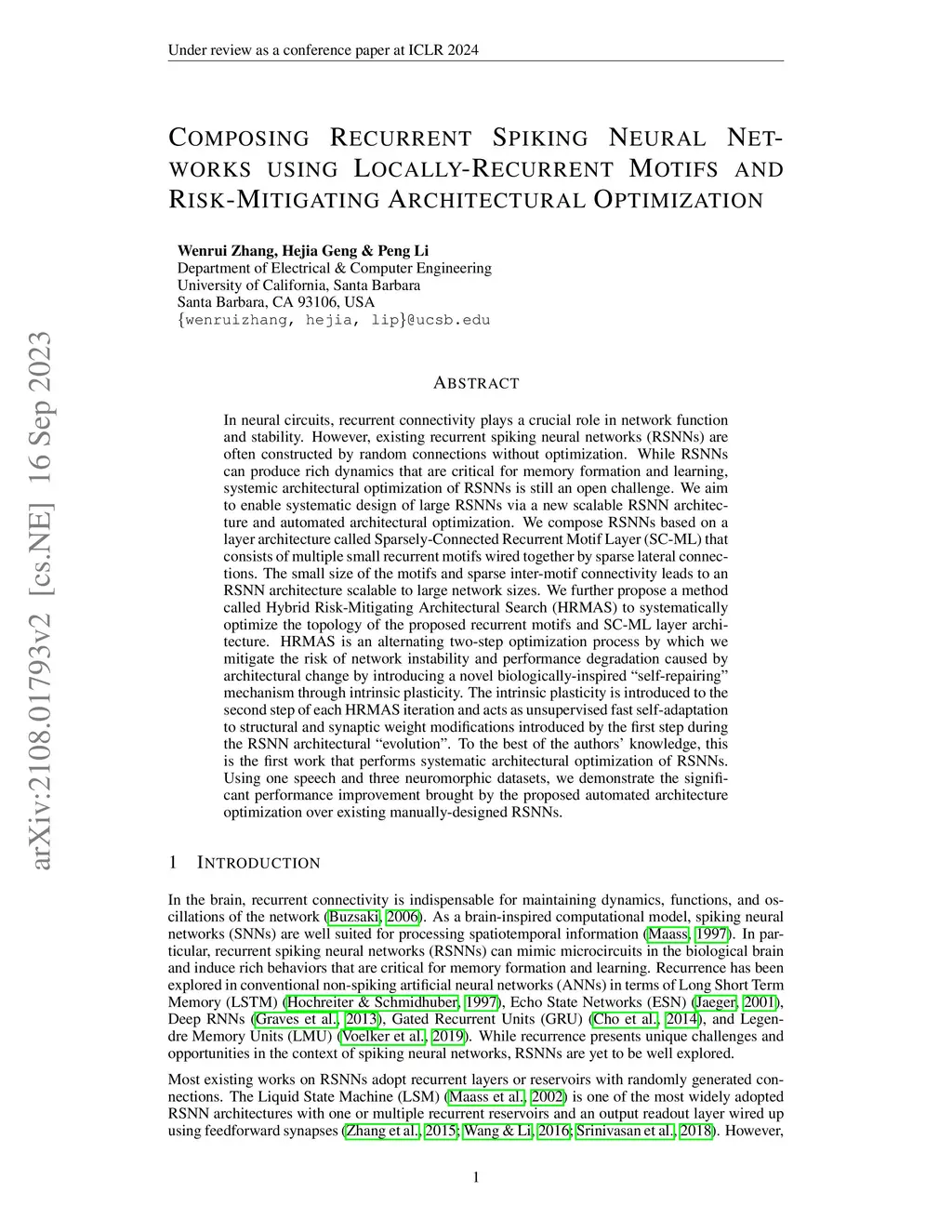 In neural circuits, recurrent connectivity plays a crucial role in network function and stability. However, existing recurrent spiking neural networks (RSNNs) are often constructed by random connections without optimization. While RSNNs can produce rich dynamics that are critical for memory formation and learning, systemic architectural optimization of RSNNs is still an opening challenge. We aim to enable systemic design of large RSNNs via a new scalable RSNN architecture and automated architectural optimization. We compose RSNNs based on a layer architecture called Sparsely-Connected Recurrent Motif Layer (SC-ML) that consists of multiple small recurrent motifs wired together by sparse lateral connections. The small size of the motifs and sparse inter-motif connectivity leads to an RSNN architecture scalable to large network sizes. We further propose a method called Hybrid Risk-Mitigating Architectural Search (HRMAS) to systematically optimize the topology of the proposed recurrent motifs and SC-ML layer architecture. HRMAS is an alternating two-step optimization process by which we mitigate the risk of network instability and performance degradation caused by architectural change by introducing a novel biologically-inspired "self-repairing" mechanism through intrinsic plasticity. The intrinsic plasticity is introduced to the second step of each HRMAS iteration and acts as unsupervised fast self-adaption to structural and synaptic weight modifications introduced by the first step during the RSNN architectural "evolution". To the best of the authors' knowledge, this is the first work that performs systematic architectural optimization of RSNNs. Using one speech and three neuromorphic datasets, we demonstrate the significant performance improvement brought by the proposed automated architecture optimization over existing manually-designed RSNNs.