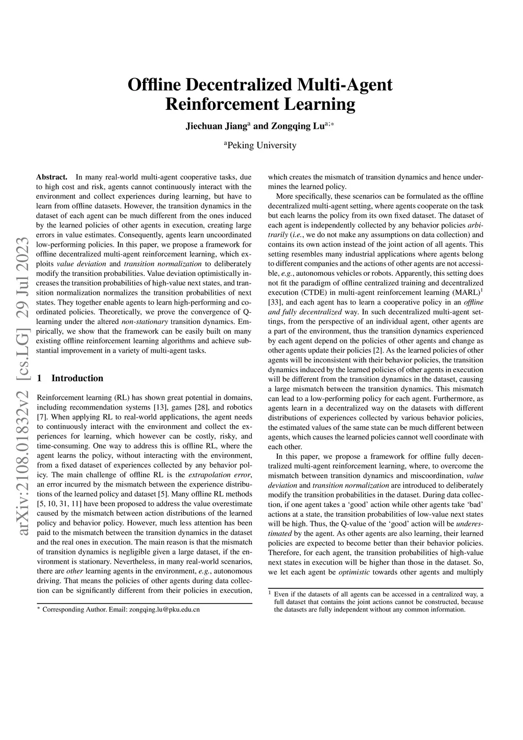 In many real-world multi-agent cooperative tasks, due to high cost and risk, agents cannot continuously interact with the environment and collect experiences during learning, but have to learn from offline datasets. However, the transition dynamics in the dataset of each agent can be much different from the ones induced by the learned policies of other agents in execution, creating large errors in value estimates. Consequently, agents learn uncoordinated low-performing policies. In this paper, we propose a framework for offline decentralized multi-agent reinforcement learning, which exploits value deviation and transition normalization to deliberately modify the transition probabilities. Value deviation optimistically increases the transition probabilities of high-value next states, and transition normalization normalizes the transition probabilities of next states. They together enable agents to learn high-performing and coordinated policies. Theoretically, we prove the convergence of Q-learning under the altered non-stationary transition dynamics. Empirically, we show that the framework can be easily built on many existing offline reinforcement learning algorithms and achieve substantial improvement in a variety of multi-agent tasks.