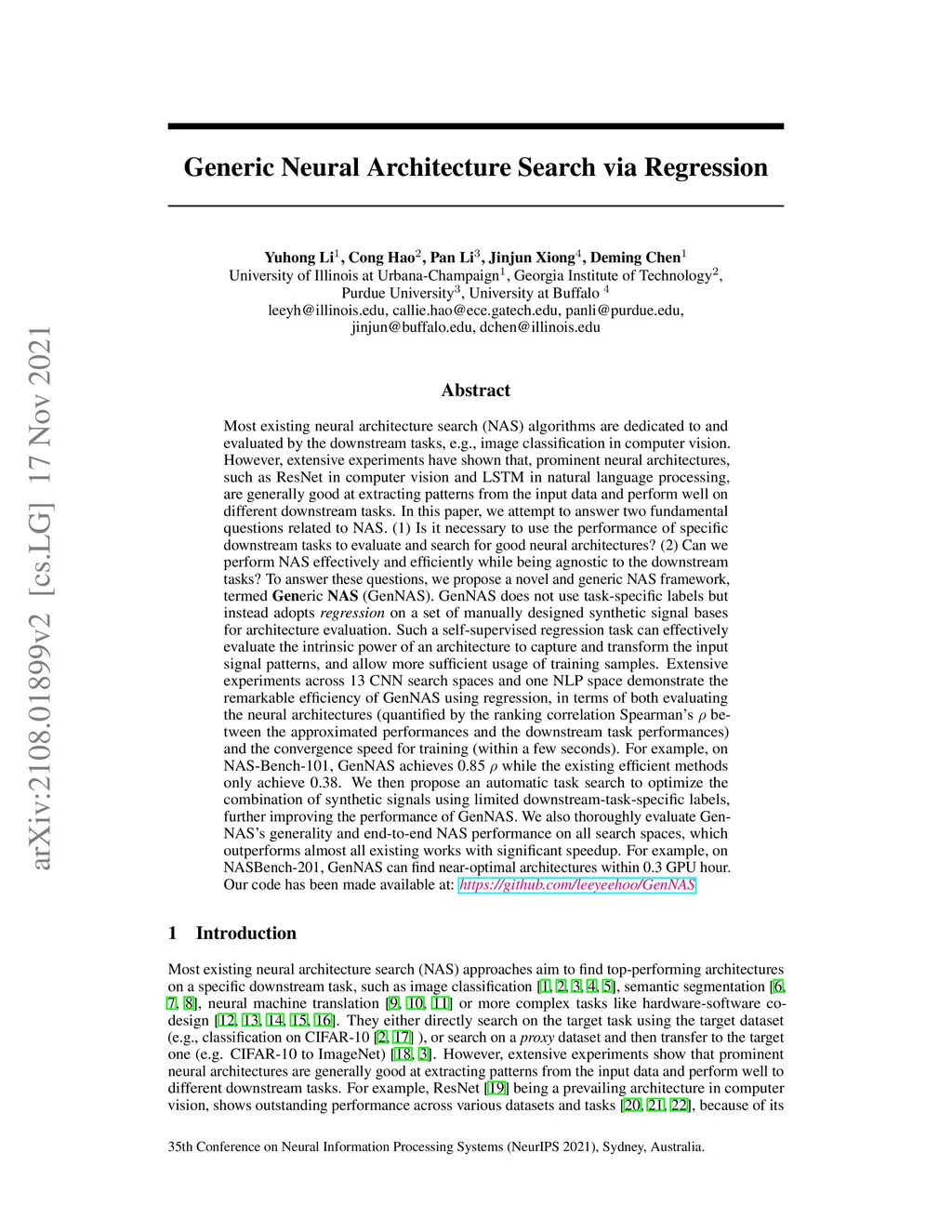 Most existing neural architecture search (NAS) algorithms are dedicated to and evaluated by the downstream tasks, e.g., image classification in computer vision. However, extensive experiments have shown that, prominent neural architectures, such as ResNet in computer vision and LSTM in natural language processing, are generally good at extracting patterns from the input data and perform well on different downstream tasks. In this paper, we attempt to answer two fundamental questions related to NAS. (1) Is it necessary to use the performance of specific downstream tasks to evaluate and search for good neural architectures? (2) Can we perform NAS effectively and efficiently while being agnostic to the downstream tasks? To answer these questions, we propose a novel and generic NAS framework, termed Generic NAS (GenNAS). GenNAS does not use task-specific labels but instead adopts regression on a set of manually designed synthetic signal bases for architecture evaluation. Such a self-supervised regression task can effectively evaluate the intrinsic power of an architecture to capture and transform the input signal patterns, and allow more sufficient usage of training samples. Extensive experiments across 13 CNN search spaces and one NLP space demonstrate the remarkable efficiency of GenNAS using regression, in terms of both evaluating the neural architectures (quantified by the ranking correlation Spearman's rho between the approximated performances and the downstream task performances) and the convergence speed for training (within a few seconds).