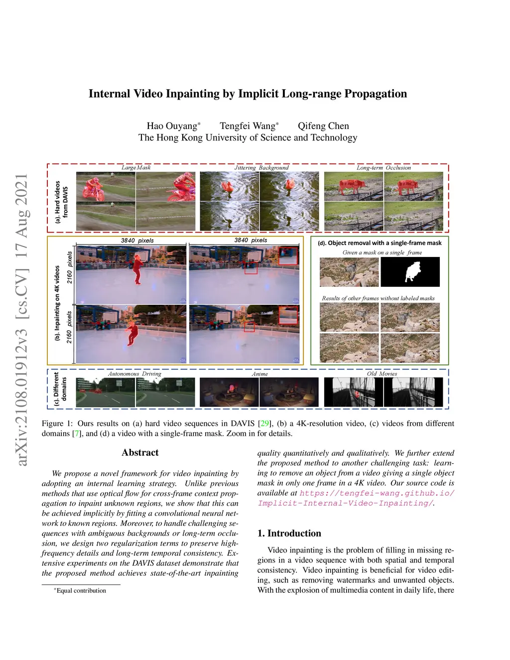 Internal Video Inpainting by Implicit Long-range Propagation