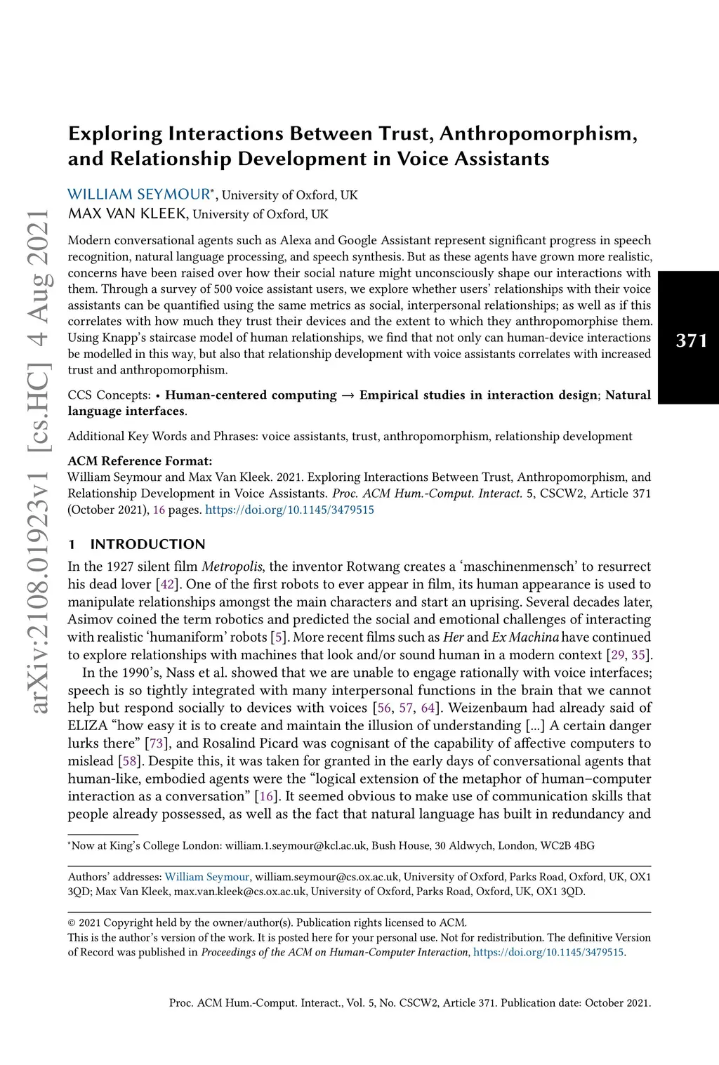 Modern conversational agents such as Alexa and Google Assistant represent significant progress in speech recognition, natural language processing, and speech synthesis. But as these agents have grown more realistic, concerns have been raised over how their social nature might unconsciously shape our interactions with them. Through a survey of 500 voice assistant users, we explore whether users' relationships with their voice assistants can be quantified using the same metrics as social, interpersonal relationships; as well as if this correlates with how much they trust their devices and the extent to which they anthropomorphise them. Using Knapp's staircase model of human relationships, we find that not only can human-device interactions be modelled in this way, but also that relationship development with voice assistants correlates with increased trust and anthropomorphism.