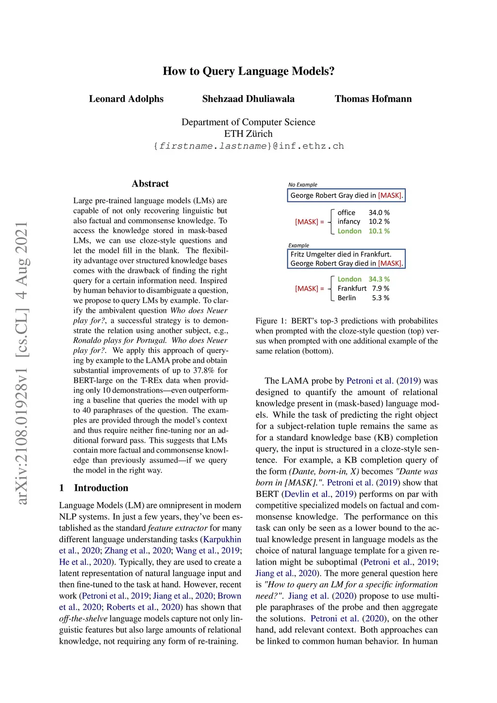Large pre-trained language models (LMs) are capable of not only recovering linguistic but also factual and commonsense knowledge. To access the knowledge stored in mask-based LMs, we can use cloze-style questions and let the model fill in the blank. The flexibility advantage over structured knowledge bases comes with the drawback of finding the right query for a certain information need. Inspired by human behavior to disambiguate a question, we propose to query LMs by example. To clarify the ambivalent question "Who does Neuer play for?", a successful strategy is to demonstrate the relation using another subject, e.g., "Ronaldo plays for Portugal. Who does Neuer play for?". We apply this approach of querying by example to the LAMA probe and obtain substantial improvements of up to 37.8% for BERT-large on the T-REx data when providing only 10 demonstrations--even outperforming a baseline that queries the model with up to 40 paraphrases of the question. The examples are provided through the model's context and thus require neither fine-tuning nor an additional forward pass. This suggests that LMs contain more factual and commonsense knowledge than previously assumed--if we query the model in the right way.
