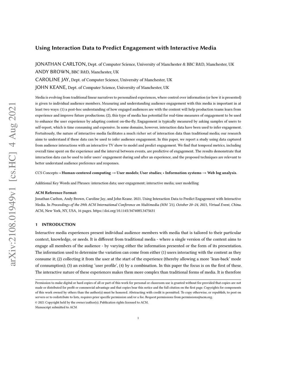 Media is evolving from traditional linear narratives to personalised experiences, where control over information (or how it is presented) is given to individual audience members. Measuring and understanding audience engagement with this media is important in at least two ways: (1) a post-hoc understanding of how engaged audiences are with the content will help production teams learn from experience and improve future productions; (2), this type of media has potential for real-time measures of engagement to be used to enhance the user experience by adapting content on-the-fly. Engagement is typically measured by asking samples of users to self-report, which is time consuming and expensive. In some domains, however, interaction data have been used to infer engagement. Fortuitously, the nature of interactive media facilitates a much richer set of interaction data than traditional media; our research aims to understand if these data can be used to infer audience engagement. In this paper, we report a study using data captured from audience interactions with an interactive TV show to model and predict engagement. We find that temporal metrics, including overall time spent on the experience and the interval between events, are predictive of engagement. The results demonstrate that interaction data can be used to infer users' engagement during and after an experience, and the proposed techniques are relevant to better understand audience preference and responses.