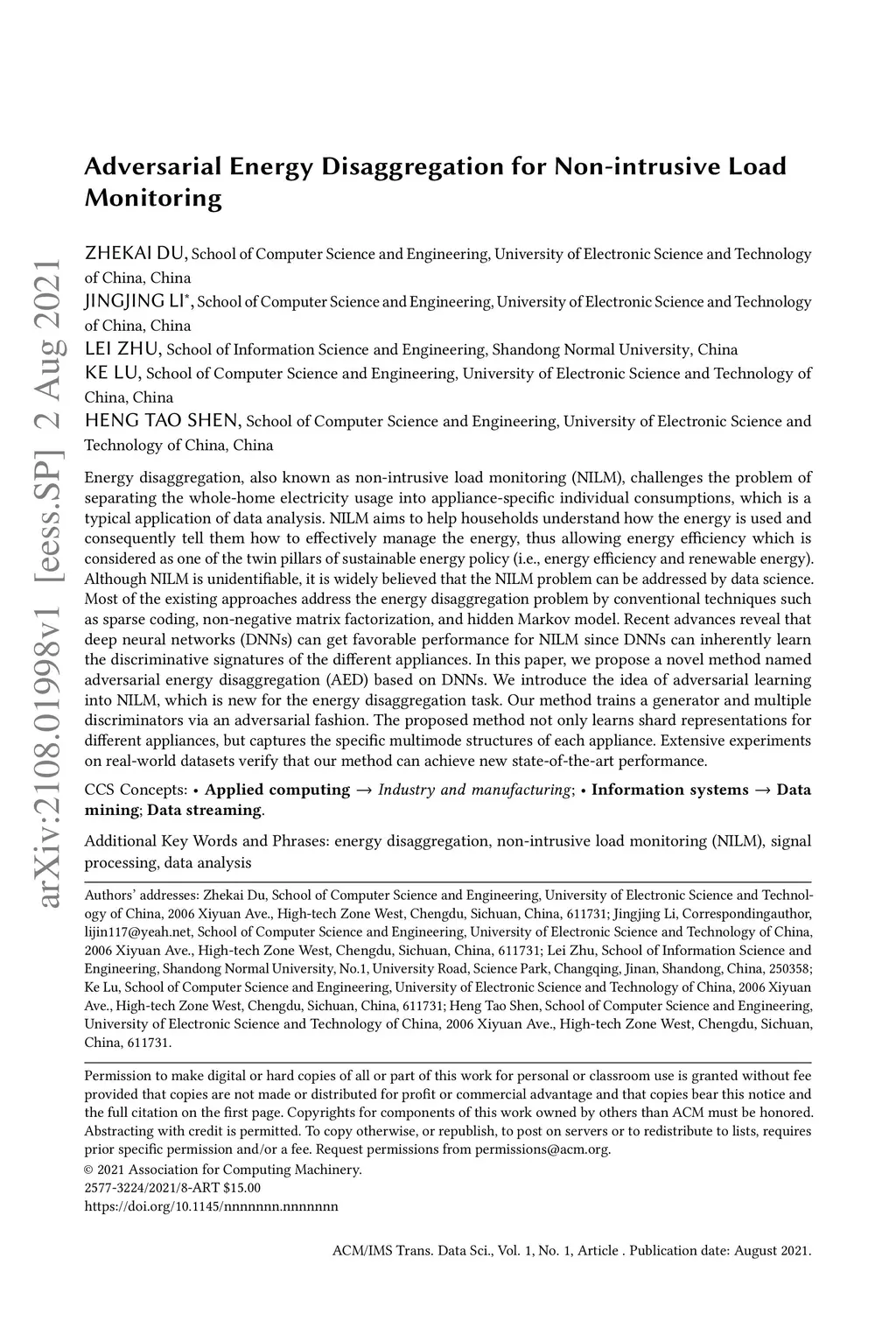 Energy disaggregation, also known as non-intrusive load monitoring (NILM), challenges the problem of separating the whole-home electricity usage into appliance-specific individual consumptions, which is a typical application of data analysis. {NILM aims to help households understand how the energy is used and consequently tell them how to effectively manage the energy, thus allowing energy efficiency which is considered as one of the twin pillars of sustainable energy policy (i.e., energy efficiency and renewable energy).} Although NILM is unidentifiable, it is widely believed that the NILM problem can be addressed by data science. Most of the existing approaches address the energy disaggregation problem by conventional techniques such as sparse coding, non-negative matrix factorization, and hidden Markov model. Recent advances reveal that deep neural networks (DNNs) can get favorable performance for NILM since DNNs can inherently learn the discriminative signatures of the different appliances. In this paper, we propose a novel method named adversarial energy disaggregation (AED) based on DNNs. We introduce the idea of adversarial learning into NILM, which is new for the energy disaggregation task. Our method trains a generator and multiple discriminators via an adversarial fashion. The proposed method not only learns shard representations for different appliances, but captures the specific multimode structures of each appliance. Extensive experiments on real-world datasets verify that our method can achieve new state-of-the-art performance.