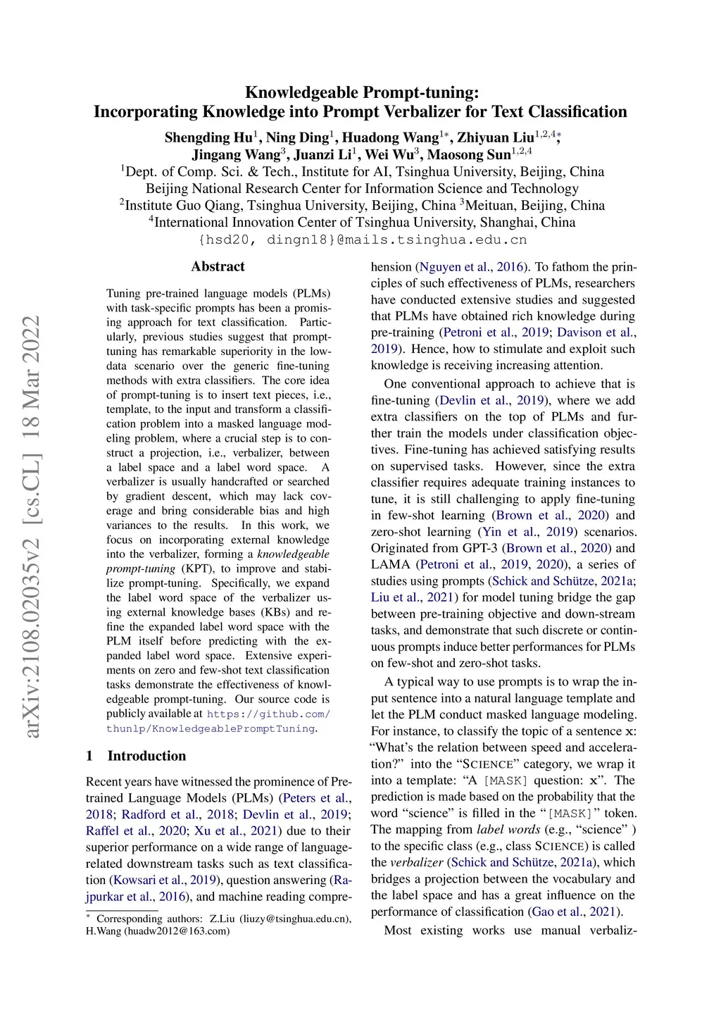 Knowledgeable Prompt-tuning: Incorporating Knowledge into Prompt