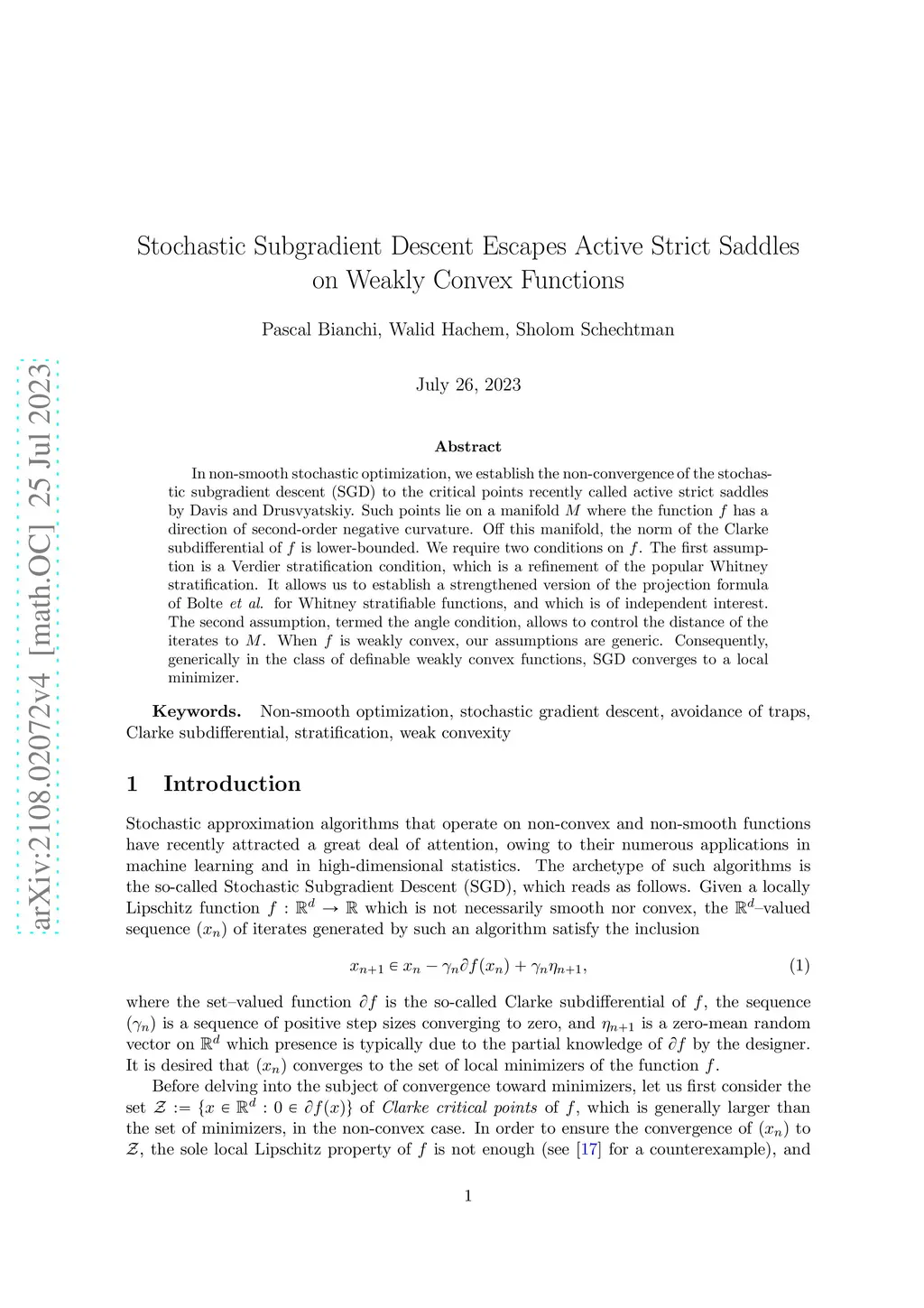In non-smooth stochastic optimization, we establish the non-convergence of the stochastic subgradient descent (SGD) to the critical points recently called active strict saddles by Davis and Drusvyatskiy. Such points lie on a manifold where the function has a direction of second-order negative curvature. Off this manifold, the norm of the Clarke subdifferential of is lower-bounded. We require two conditions on . The first assumption is a Verdier stratification condition, which is a refinement of the popular Whitney stratification. It allows us to establish a reinforced version of the projection formula of Bolte \emph{et.al.} for Whitney stratifiable functions, and which is of independent interest. The second assumption, termed the angle condition, allows to control the distance of the iterates to . When is weakly convex, our assumptions are generic. Consequently, generically in the class of definable weakly convex functions, the SGD converges to a local minimizer.