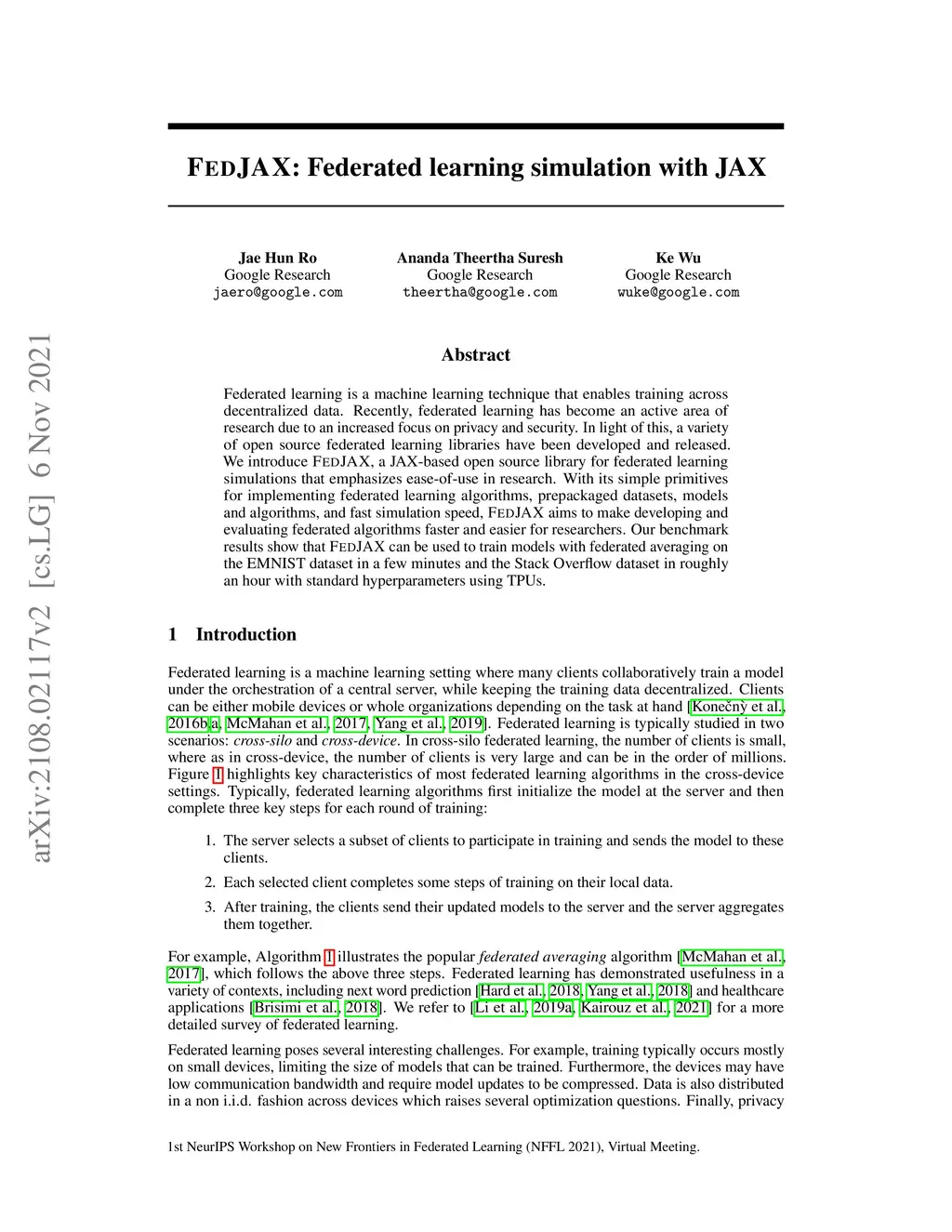 Federated learning is a machine learning technique that enables training across decentralized data. Recently, federated learning has become an active area of research due to an increased focus on privacy and security. In light of this, a variety of open source federated learning libraries have been developed and released. We introduce FedJAX, a JAX-based open source library for federated learning simulations that emphasizes ease-of-use in research. With its simple primitives for implementing federated learning algorithms, prepackaged datasets, models and algorithms, and fast simulation speed, FedJAX aims to make developing and evaluating federated algorithms faster and easier for researchers. Our benchmark results show that FedJAX can be used to train models with federated averaging on the EMNIST dataset in a few minutes and the Stack Overflow dataset in roughly an hour with standard hyperparameters using TPUs.