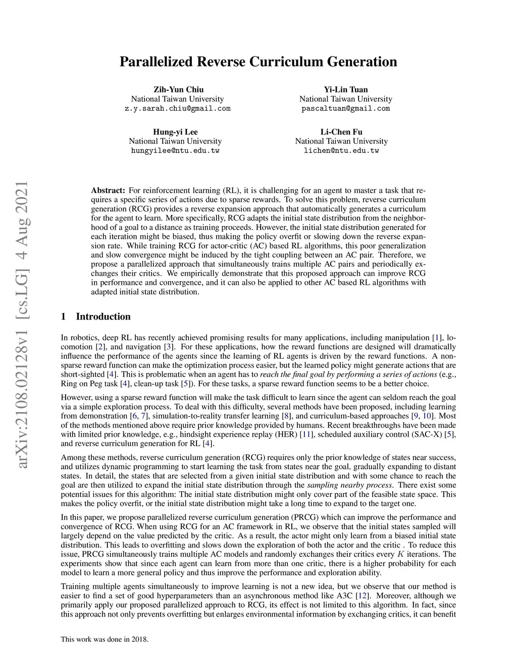 For reinforcement learning (RL), it is challenging for an agent to master a task that requires a specific series of actions due to sparse rewards. To solve this problem, reverse curriculum generation (RCG) provides a reverse expansion approach that automatically generates a curriculum for the agent to learn. More specifically, RCG adapts the initial state distribution from the neighborhood of a goal to a distance as training proceeds. However, the initial state distribution generated for each iteration might be biased, thus making the policy overfit or slowing down the reverse expansion rate. While training RCG for actor-critic (AC) based RL algorithms, this poor generalization and slow convergence might be induced by the tight coupling between an AC pair. Therefore, we propose a parallelized approach that simultaneously trains multiple AC pairs and periodically exchanges their critics. We empirically demonstrate that this proposed approach can improve RCG in performance and convergence, and it can also be applied to other AC based RL algorithms with adapted initial state distribution.