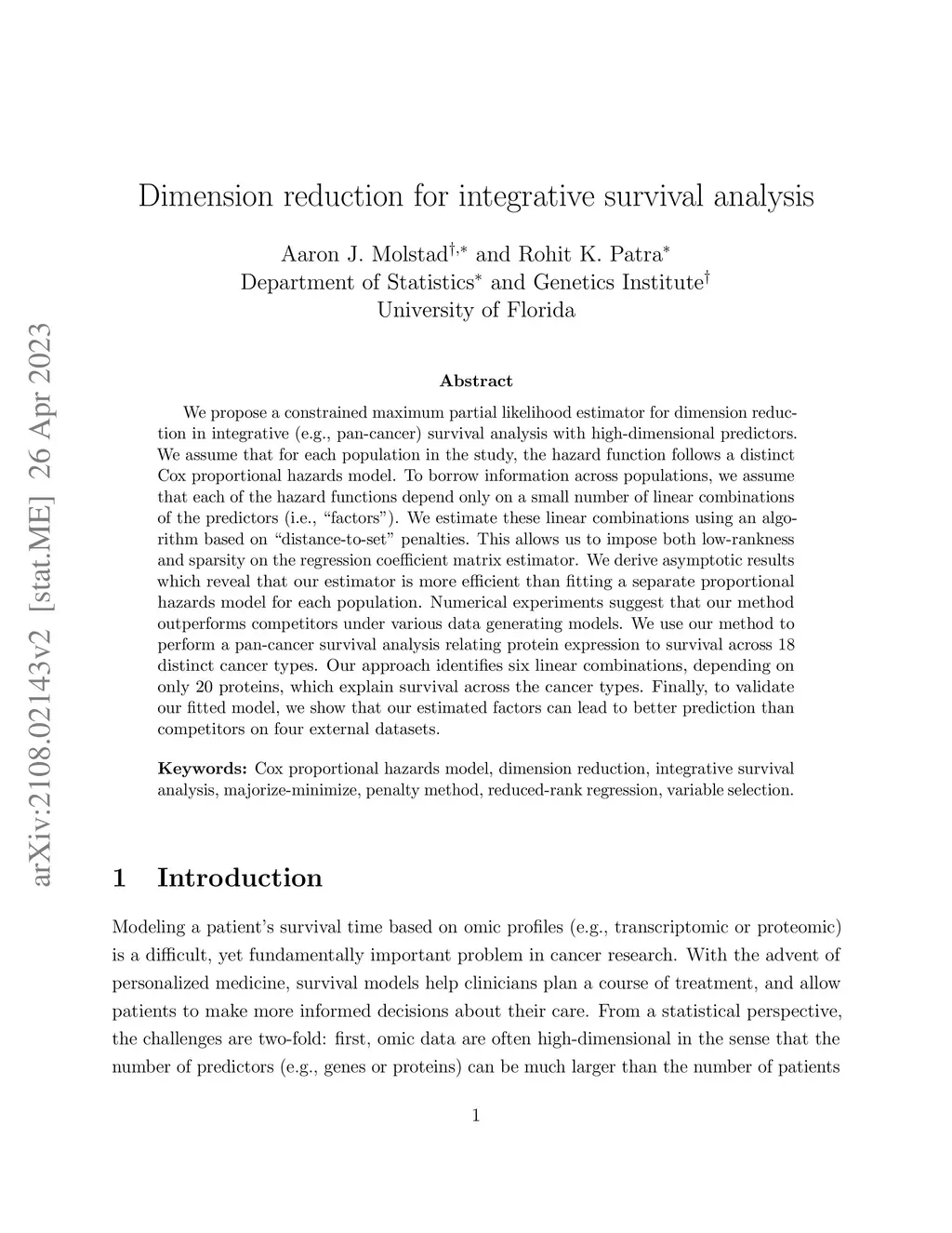 We propose a constrained maximum partial likelihood estimator for dimension reduction in integrative (e.g., pan-cancer) survival analysis with high-dimensional covariates. We assume that for each population in the study, the hazard function follows a distinct Cox proportional hazards model. To borrow information across populations, we assume that all of the hazard functions depend only on a small number of linear combinations of the predictors. We estimate these linear combinations using an algorithm based on "distance-to-set" penalties. This allows us to impose both low-rankness and sparsity. We derive asymptotic results which reveal that our regression coefficient estimator is more efficient than fitting a separate proportional hazards model for each population. Numerical experiments suggest that our method outperforms related competitors under various data generating models. We use our method to perform a pan-cancer survival analysis relating protein expression to survival across 18 distinct cancer types. Our approach identifies six linear combinations, depending on only 20 proteins, which explain survival across the cancer types. Finally, we validate our fitted model on four external datasets and show that our estimated coefficients can lead to better prediction than popular competitors.