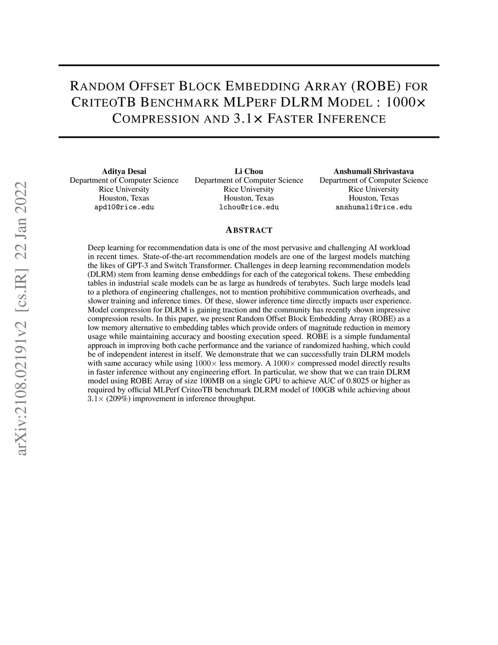 Random Offset Block Embedding Array (ROBE) for CriteoTB Benchmark MLPerf