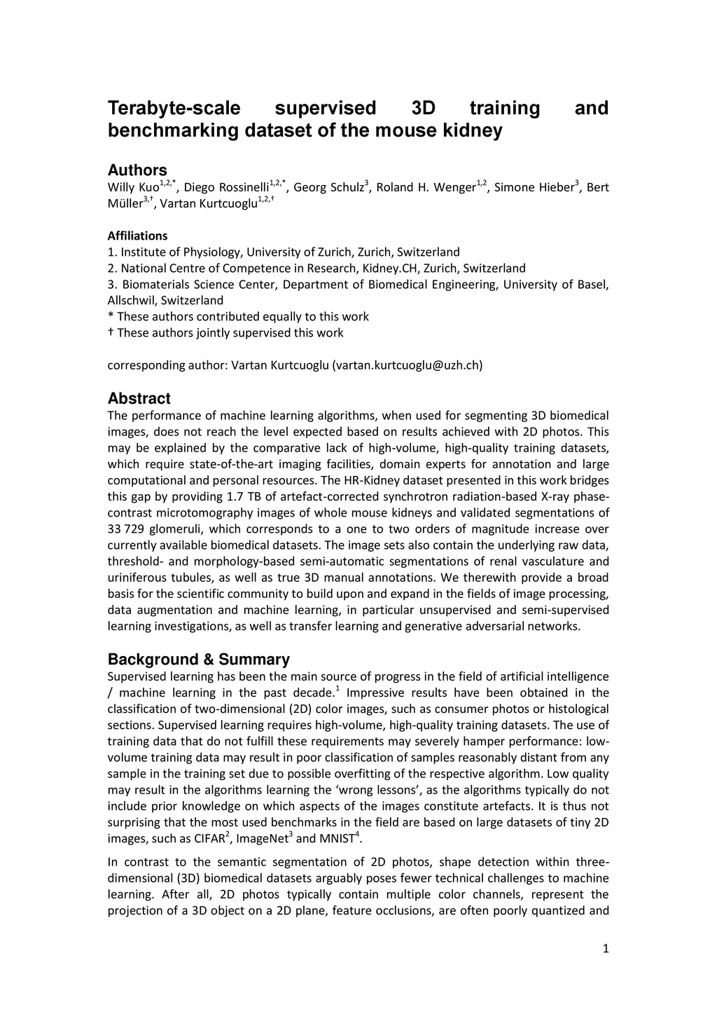 The performance of machine learning algorithms, when used for segmenting 3D biomedical images, does not reach the level expected based on results achieved with 2D photos. This may be explained by the comparative lack of high-volume, high-quality training datasets, which require state-of-the-art imaging facilities, domain experts for annotation and large computational and personal resources. The HR-Kidney dataset presented in this work bridges this gap by providing 1.7 TB of artefact-corrected synchrotron radiation-based X-ray phase-contrast microtomography images of whole mouse kidneys and validated segmentations of 33 729 glomeruli, which corresponds to a one to two orders of magnitude increase over currently available biomedical datasets. The image sets also contain the underlying raw data, threshold- and morphology-based semi-automatic segmentations of renal vasculature and uriniferous tubules, as well as true 3D manual annotations. We therewith provide a broad basis for the scientific community to build upon and expand in the fields of image processing, data augmentation and machine learning, in particular unsupervised and semi-supervised learning investigations, as well as transfer learning and generative adversarial networks.