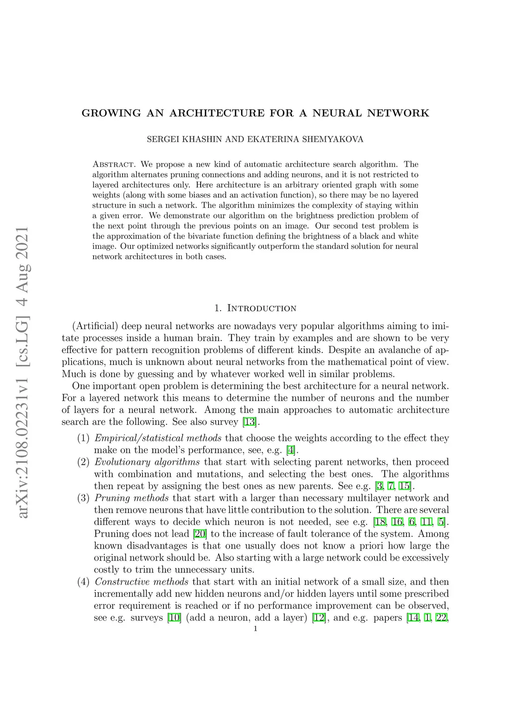 We propose a new kind of automatic architecture search algorithm. The algorithm alternates pruning connections and adding neurons, and it is not restricted to layered architectures only. Here architecture is an arbitrary oriented graph with some weights (along with some biases and an activation function), so there may be no layered structure in such a network. The algorithm minimizes the complexity of staying within a given error. We demonstrate our algorithm on the brightness prediction problem of the next point through the previous points on an image. Our second test problem is the approximation of the bivariate function defining the brightness of a black and white image. Our optimized networks significantly outperform the standard solution for neural network architectures in both cases.