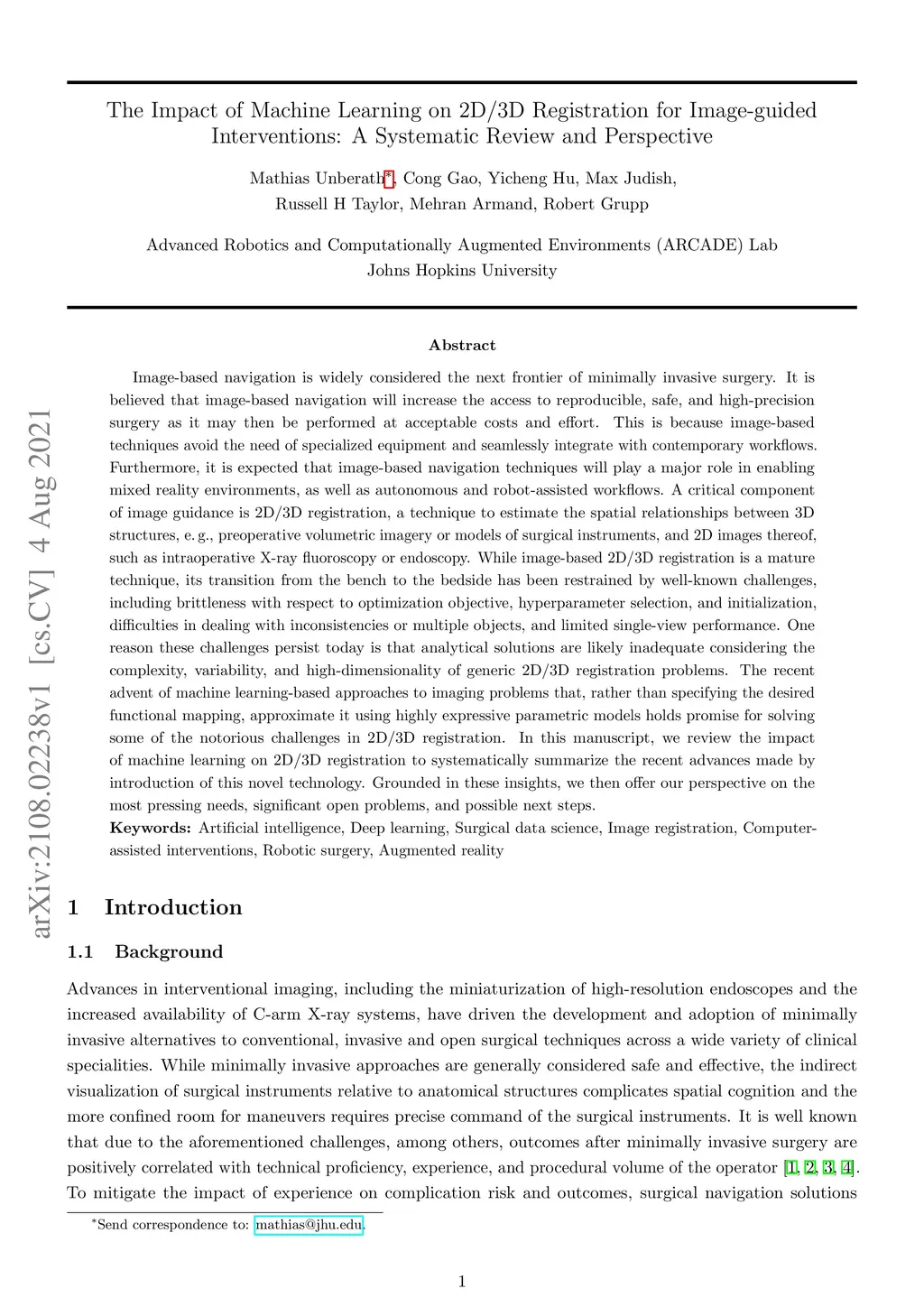 Image-based navigation is widely considered the next frontier of minimally invasive surgery. It is believed that image-based navigation will increase the access to reproducible, safe, and high-precision surgery as it may then be performed at acceptable costs and effort. This is because image-based techniques avoid the need of specialized equipment and seamlessly integrate with contemporary workflows. Further, it is expected that image-based navigation will play a major role in enabling mixed reality environments and autonomous, robotic workflows. A critical component of image guidance is 2D/3D registration, a technique to estimate the spatial relationships between 3D structures, e.g., volumetric imagery or tool models, and 2D images thereof, such as fluoroscopy or endoscopy. While image-based 2D/3D registration is a mature technique, its transition from the bench to the bedside has been restrained by well-known challenges, including brittleness of the optimization objective, hyperparameter selection, and initialization, difficulties around inconsistencies or multiple objects, and limited single-view performance. One reason these challenges persist today is that analytical solutions are likely inadequate considering the complexity, variability, and high-dimensionality of generic 2D/3D registration problems. The recent advent of machine learning-based approaches to imaging problems that, rather than specifying the desired functional mapping, approximate it using highly expressive parametric models holds promise for solving some of the notorious challenges in 2D/3D registration. In this manuscript, we review the impact of machine learning on 2D/3D registration to systematically summarize the recent advances made by introduction of this novel technology. Grounded in these insights, we then offer our perspective on the most pressing needs, significant open problems, and possible next steps.