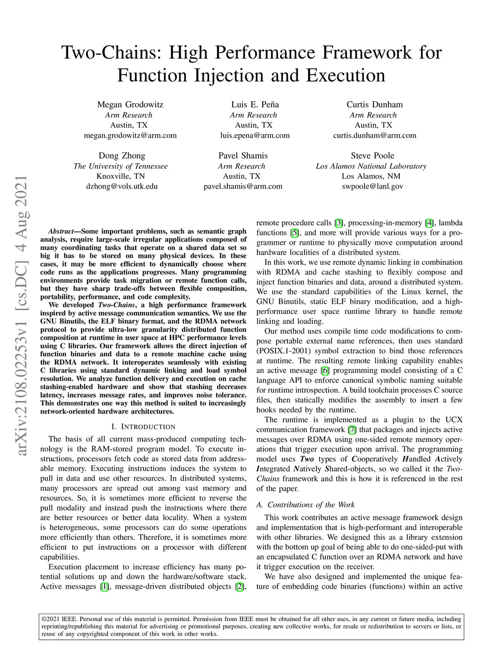 Some important problems, such as semantic graph analysis, require large-scale irregular applications composed of many coordinating tasks that operate on a shared data set so big it has to be stored on many physical devices. In these cases, it may be more efficient to dynamically choose where code runs as the applications progresses. Many programming environments provide task migration or remote function calls, but they have sharp trade-offs between flexible composition, portability, performance, and code complexity. We developed Two-Chains, a high performance framework inspired by active message communication semantics. We use the GNU Binutils, the ELF binary format, and the RDMA network protocol to provide ultra-low granularity distributed function composition at runtime in user space at HPC performance levels using C libraries. Our framework allows the direct injection of function binaries and data to a remote machine cache using the RDMA network. It interoperates seamlessly with existing C libraries using standard dynamic linking and load symbol resolution. We analyze function delivery and execution on cache stashing-enabled hardware and show that stashing decreases latency, increases message rates, and improves noise tolerance. This demonstrates one way this method is suited to increasingly network-oriented hardware architectures.