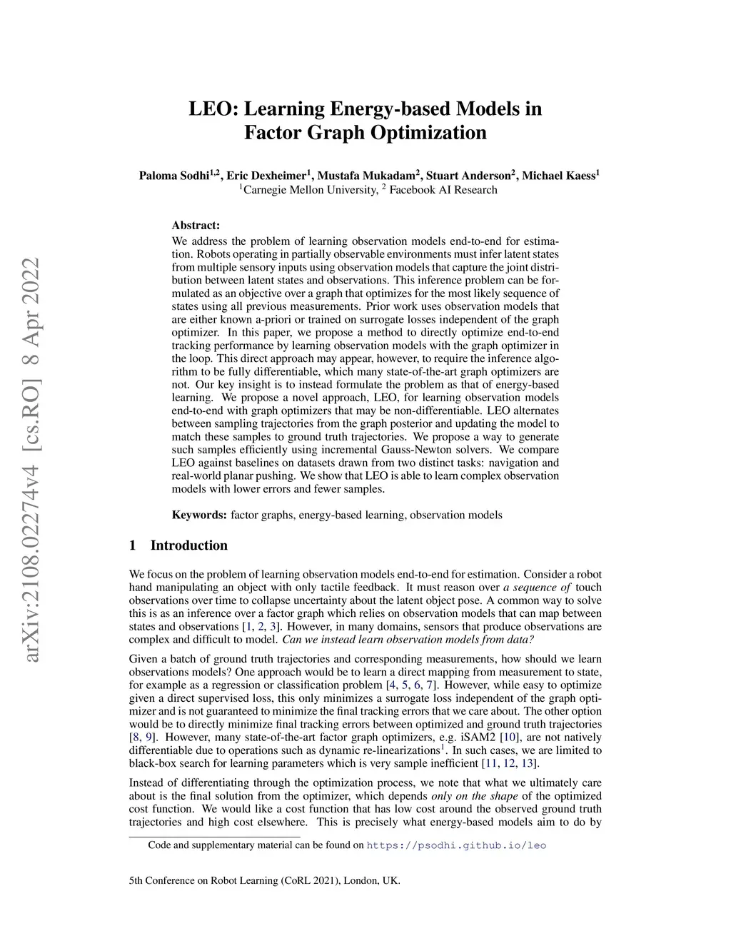 LEO: Learning Energy-based Models in Factor Graph Optimization