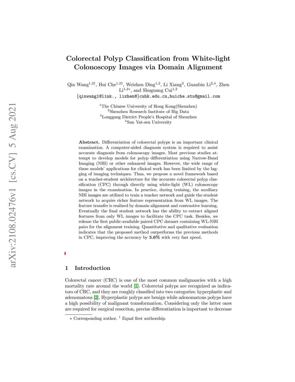 Differentiation of colorectal polyps is an important clinical examination. A computer-aided diagnosis system is required to assist accurate diagnosis from colonoscopy images. Most previous studies at-tempt to develop models for polyp differentiation using Narrow-Band Imaging (NBI) or other enhanced images. However, the wide range of these models' applications for clinical work has been limited by the lagging of imaging techniques. Thus, we propose a novel framework based on a teacher-student architecture for the accurate colorectal polyp classification (CPC) through directly using white-light (WL) colonoscopy images in the examination. In practice, during training, the auxiliary NBI images are utilized to train a teacher network and guide the student network to acquire richer feature representation from WL images. The feature transfer is realized by domain alignment and contrastive learning. Eventually the final student network has the ability to extract aligned features from only WL images to facilitate the CPC task. Besides, we release the first public-available paired CPC dataset containing WL-NBI pairs for the alignment training. Quantitative and qualitative evaluation indicates that the proposed method outperforms the previous methods in CPC, improving the accuracy by 5.6%with very fast speed.