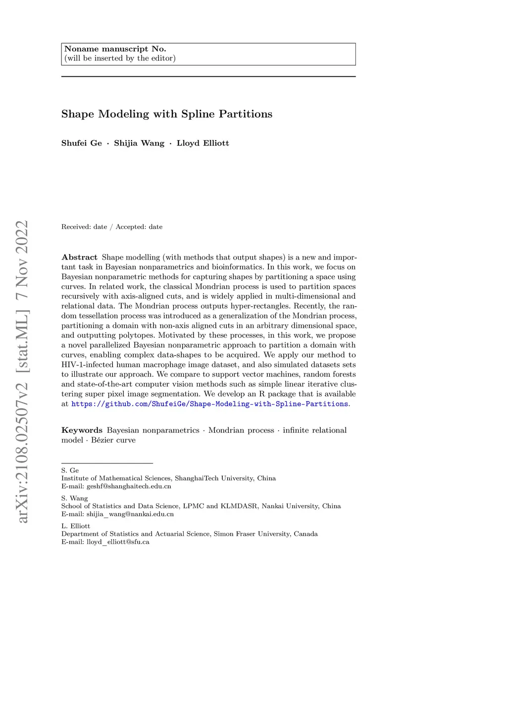 Shape modelling (with methods that output shapes) is a new and important task in Bayesian nonparametrics and bioinformatics. In this work, we focus on Bayesian nonparametric methods for capturing shapes by partitioning a space using curves. In related work, the classical Mondrian process is used to partition spaces recursively with axis-aligned cuts, and is widely applied in multi-dimensional and relational data. The Mondrian process outputs hyper-rectangles. Recently, the random tessellation process was introduced as a generalization of the Mondrian process, partitioning a domain with non-axis aligned cuts in an arbitrary dimensional space, and outputting polytopes. Motivated by these processes, in this work, we propose a novel parallelized Bayesian nonparametric approach to partition a domain with curves, enabling complex data-shapes to be acquired. We apply our method to HIV-1-infected human macrophage image dataset, and also simulated datasets sets to illustrate our approach. We compare to support vector machines, random forests and state-of-the-art computer vision methods such as simple linear iterative clustering super pixel image segmentation. We develop an R package that is available at \url{https://github.com/ShufeiGe/Shape-Modeling-with-Spline-Partitions}.