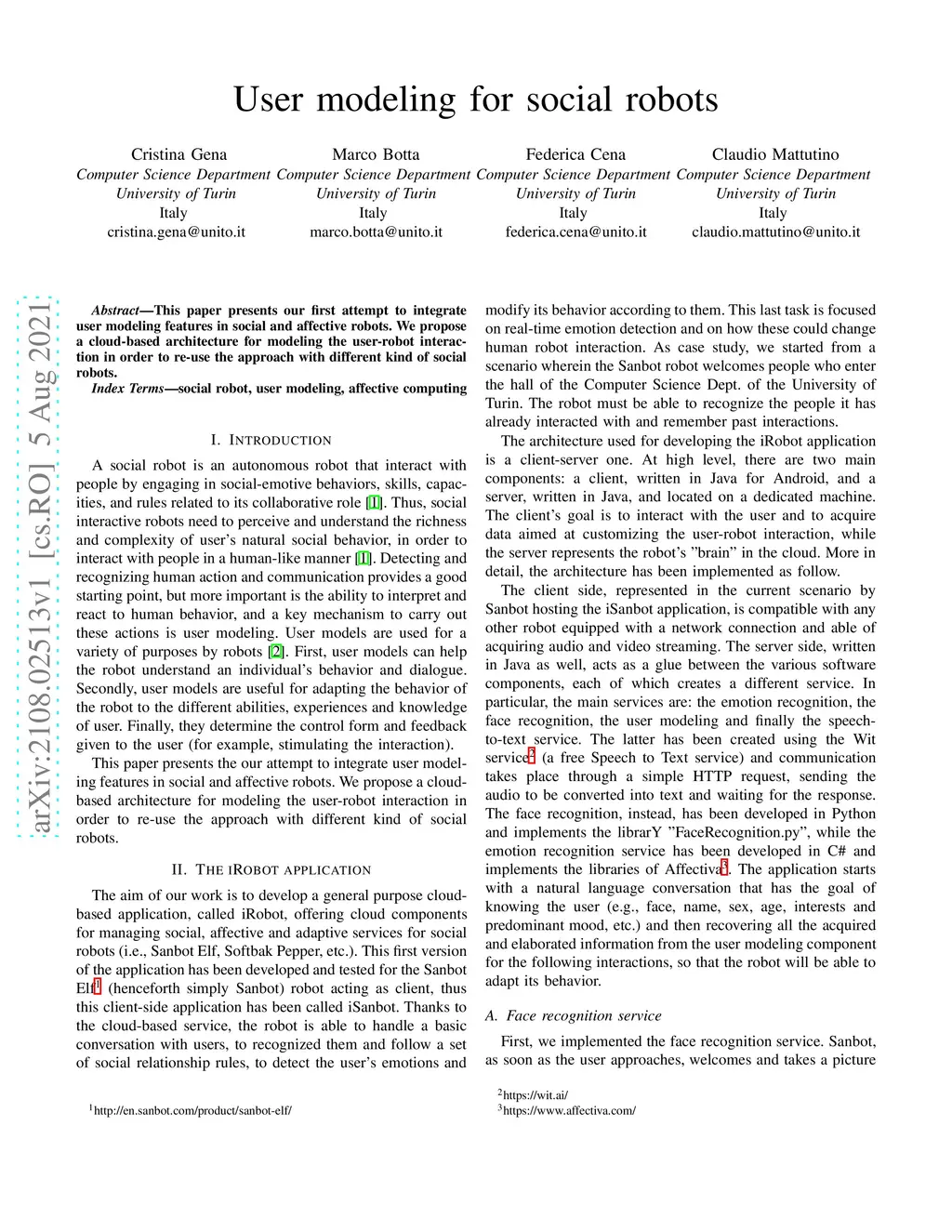 This paper presents our first attempt to integrate user modeling features in social and affective robots. We propose a cloud-based architecture for modeling the user-robot interaction in order to re-use the approach with different kind of social robots.