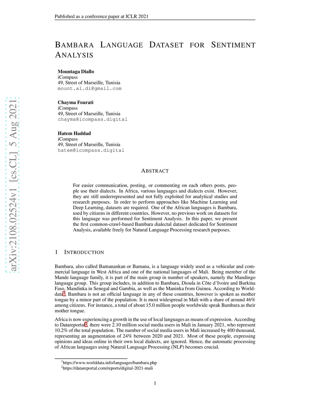 Bambara Language Dataset for Sentiment Analysis