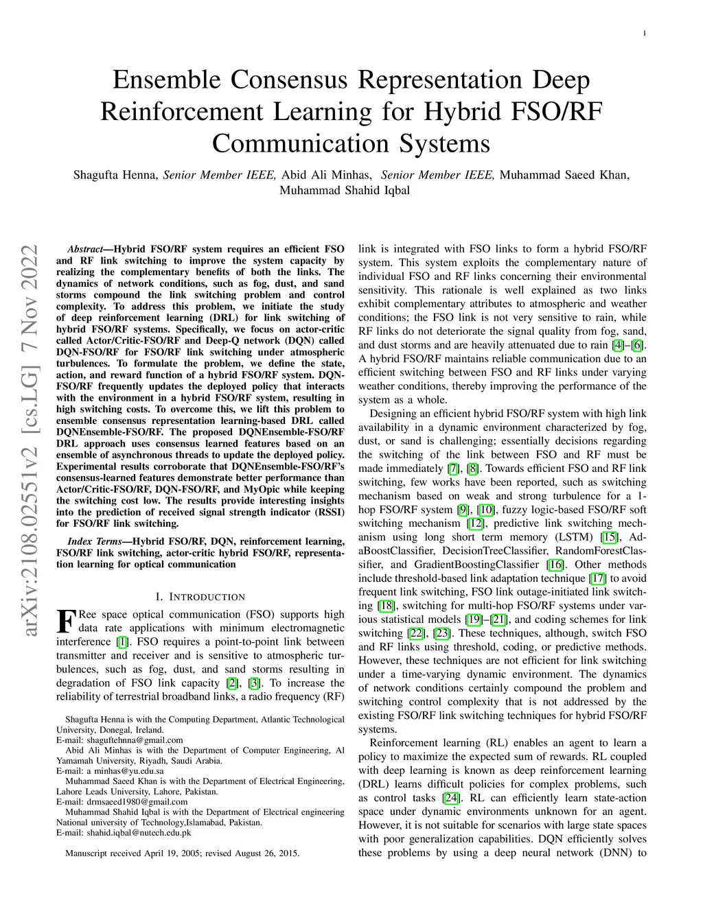 Hybrid FSO/RF system requires an efficient FSO and RF link switching mechanism to improve the system capacity by realizing the complementary benefits of both the links. The dynamics of network conditions, such as fog, dust, and sand storms compound the link switching problem and control complexity. To address this problem, we initiate the study of deep reinforcement learning (DRL) for link switching of hybrid FSO/RF systems. Specifically, in this work, we focus on actor-critic called Actor/Critic-FSO/RF and Deep-Q network (DQN) called DQN-FSO/RF for FSO/RF link switching under atmospheric turbulences. To formulate the problem, we define the state, action, and reward function of a hybrid FSO/RF system. DQN-FSO/RF frequently updates the deployed policy that interacts with the environment in a hybrid FSO/RF system, resulting in high switching costs. To overcome this, we lift this problem to ensemble consensus-based representation learning for deep reinforcement called DQNEnsemble-FSO/RF. The proposed novel DQNEnsemble-FSO/RF DRL approach uses consensus learned features representations based on an ensemble of asynchronous threads to update the deployed policy. Experimental results corroborate that the proposed DQNEnsemble-FSO/RF's consensus-learned features switching achieves better performance than Actor/Critic-FSO/RF, DQN-FSO/RF, and MyOpic for FSO/RF link switching while keeping the switching cost significantly low.