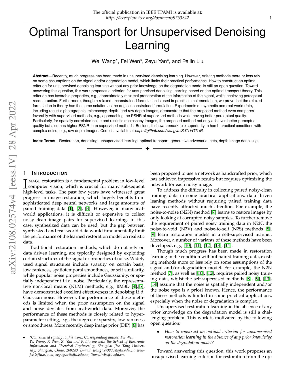 Recently, much progress has been made in unsupervised denoising learning. However, existing methods more or less rely on some assumptions on the signal and/or degradation model, which limits their practical performance. How to construct an optimal criterion for unsupervised denoising learning without any prior knowledge on the degradation model is still an open question. Toward answering this question, this work proposes a criterion for unsupervised denoising learning based on the optimal transport theory. This criterion has favorable properties, e.g., approximately maximal preservation of the information of the signal, whilst achieving perceptual reconstruction. Furthermore, though a relaxed unconstrained formulation is used in practical implementation, we prove that the relaxed formulation in theory has the same solution as the original constrained formulation. Experiments on synthetic and real-world data, including realistic photographic, microscopy, depth, and raw depth images, demonstrate that the proposed method even compares favorably with supervised methods, e.g., approaching the PSNR of supervised methods while having better perceptual quality. Particularly, for spatially correlated noise and realistic microscopy images, the proposed method not only achieves better perceptual quality but also has higher PSNR than supervised methods. Besides, it shows remarkable superiority in harsh practical conditions with complex noise, e.g., raw depth images. Code is available at https://github.com/wangweiSJTU/OTUR.