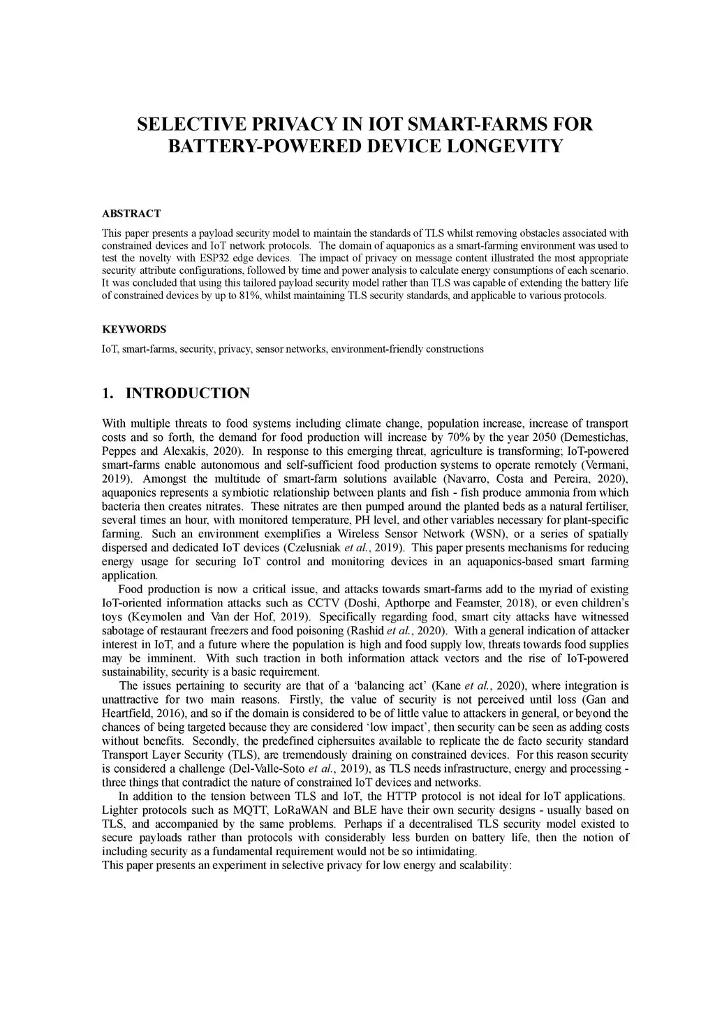 This paper presents a payload security model to maintain the standards of TLS whilst removing obstacles associated with constrained devices and IoT network protocols. The domain of aquaponics as a smart-farming environment was used to test the novelty with ESP32 edge devices. The impact of privacy on message content illustrated the most appropriate security attribute configurations, followed by time and power analysis to calculate energy consumptions of each scenario. It was concluded that using this tailored payload security model rather than TLS was capable of extending the battery life of constrained devices by up to 81%, whilst maintaining TLS security standards, and applicable to various protocols.