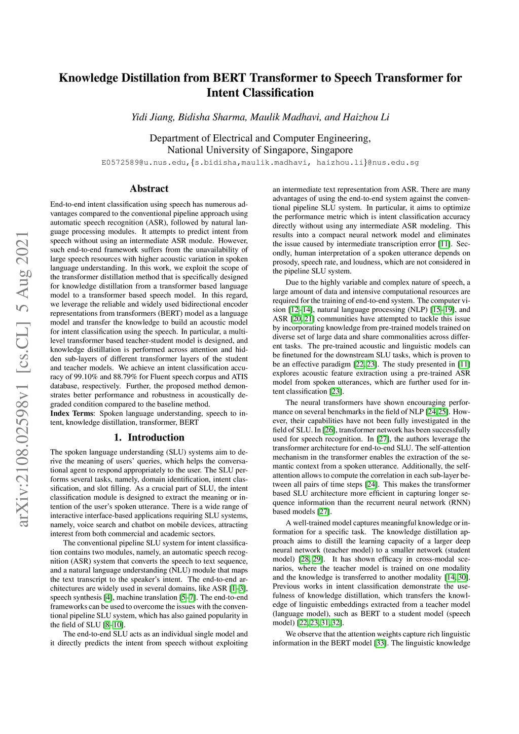 End-to-end intent classification using speech has numerous advantages compared to the conventional pipeline approach using automatic speech recognition (ASR), followed by natural language processing modules. It attempts to predict intent from speech without using an intermediate ASR module. However, such end-to-end framework suffers from the unavailability of large speech resources with higher acoustic variation in spoken language understanding. In this work, we exploit the scope of the transformer distillation method that is specifically designed for knowledge distillation from a transformer based language model to a transformer based speech model. In this regard, we leverage the reliable and widely used bidirectional encoder representations from transformers (BERT) model as a language model and transfer the knowledge to build an acoustic model for intent classification using the speech. In particular, a multilevel transformer based teacher-student model is designed, and knowledge distillation is performed across attention and hidden sub-layers of different transformer layers of the student and teacher models. We achieve an intent classification accuracy of 99.10% and 88.79% for Fluent speech corpus and ATIS database, respectively. Further, the proposed method demonstrates better performance and robustness in acoustically degraded condition compared to the baseline method.