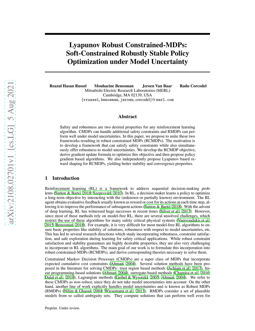 Safety and robustness are two desired properties for any reinforcement learning algorithm. CMDPs can handle additional safety constraints and RMDPs can perform well under model uncertainties. In this paper, we propose to unite these two frameworks resulting in robust constrained MDPs (RCMDPs). The motivation is to develop a framework that can satisfy safety constraints while also simultaneously offer robustness to model uncertainties. We develop the RCMDP objective, derive gradient update formula to optimize this objective and then propose policy gradient based algorithms. We also independently propose Lyapunov based reward shaping for RCMDPs, yielding better stability and convergence properties.