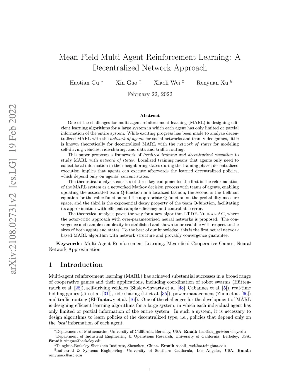 Mean-Field Multi-Agent Reinforcement Learning: A Decentralized Network