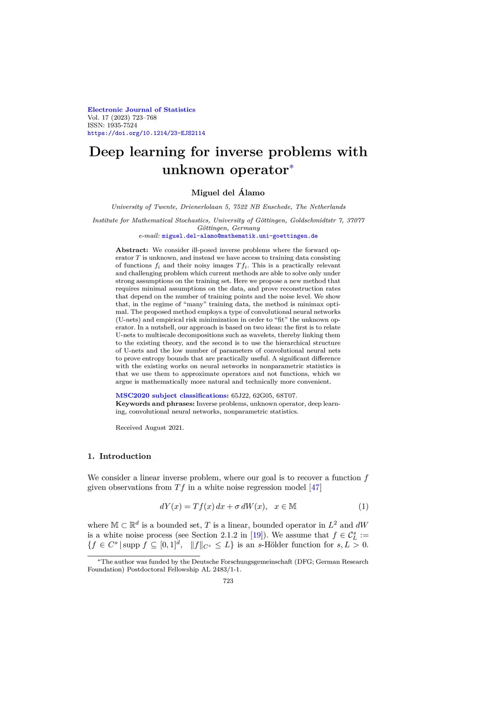 We consider ill-posed inverse problems where the forward operator is unknown, and instead we have access to training data consisting of functions and their noisy images . This is a practically relevant and challenging problem which current methods are able to solve only under strong assumptions on the training set. Here we propose a new method that requires minimal assumptions on the data, and prove reconstruction rates that depend on the number of training points and the noise level. We show that, in the regime of "many" training data, the method is minimax optimal. The proposed method employs a type of convolutional neural networks (U-nets) and empirical risk minimization in order to "fit" the unknown operator. In a nutshell, our approach is based on two ideas: the first is to relate U-nets to multiscale decompositions such as wavelets, thereby linking them to the existing theory, and the second is to use the hierarchical structure of U-nets and the low number of parameters of convolutional neural nets to prove entropy bounds that are practically useful. A significant difference with the existing works on neural networks in nonparametric statistics is that we use them to approximate operators and not functions, which we argue is mathematically more natural and technically more convenient.