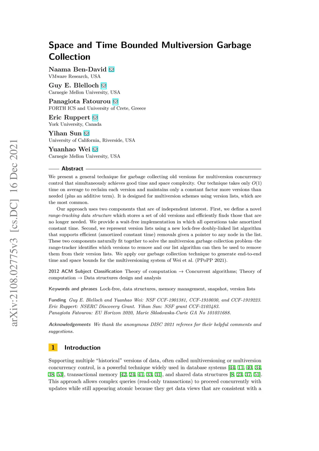 We present a general technique for garbage collecting old versions for multiversion concurrency control that simultaneously achieves good time and space complexity. Our technique takes only time on average to reclaim each version and maintains only a constant factor more versions than needed (plus an additive term). It is designed for multiversion schemes using version lists, which are the most common. Our approach uses two components that are of independent interest. First, we define a novel range-tracking data structure which stores a set of old versions and efficiently finds those that are no longer needed. We provide a wait-free implementation in which all operations take amortized constant time. Second, we represent version lists using a new lock-free doubly-linked list algorithm that supports efficient (amortized constant time) removals given a pointer to any node in the list. These two components naturally fit together to solve the multiversion garbage collection problem--the range-tracker identifies which versions to remove and our list algorithm can then be used to remove them from their version lists. We apply our garbage collection technique to generate end-to-end time and space bounds for the multiversioning system of Wei et al. (PPoPP 2021).