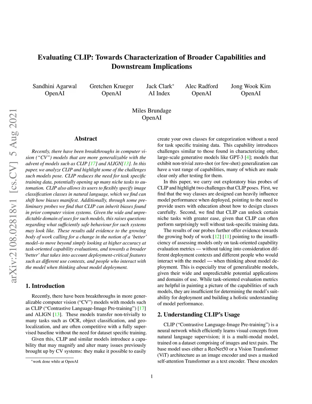 Recently, there have been breakthroughs in computer vision ("CV") models that are more generalizable with the advent of models such as CLIP and ALIGN. In this paper, we analyze CLIP and highlight some of the challenges such models pose. CLIP reduces the need for task specific training data, potentially opening up many niche tasks to automation. CLIP also allows its users to flexibly specify image classification classes in natural language, which we find can shift how biases manifest. Additionally, through some preliminary probes we find that CLIP can inherit biases found in prior computer vision systems. Given the wide and unpredictable domain of uses for such models, this raises questions regarding what sufficiently safe behaviour for such systems may look like. These results add evidence to the growing body of work calling for a change in the notion of a 'better' model--to move beyond simply looking at higher accuracy at task-oriented capability evaluations, and towards a broader 'better' that takes into account deployment-critical features such as different use contexts, and people who interact with the model when thinking about model deployment.