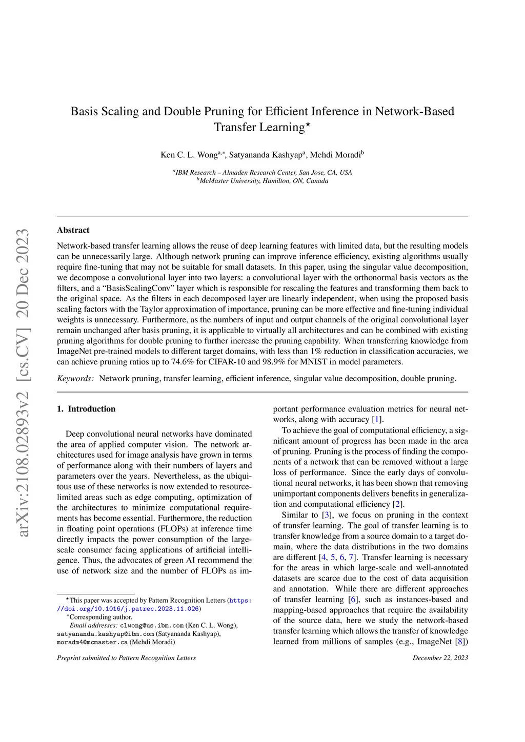 Network-based transfer learning allows the reuse of deep learning features with limited data, but the resulting models can be unnecessarily large. Although network pruning can improve inference efficiency, existing algorithms usually require fine-tuning that may not be suitable for small datasets. In this paper, using the singular value decomposition, we decompose a convolutional layer into two layers: a convolutional layer with the orthonormal basis vectors as the filters, and a "BasisScalingConv" layer which is responsible for rescaling the features and transforming them back to the original space. As the filters in each decomposed layer are linearly independent, when using the proposed basis scaling factors with the Taylor approximation of importance, pruning can be more effective and fine-tuning individual weights is unnecessary. Furthermore, as the numbers of input and output channels of the original convolutional layer remain unchanged after basis pruning, it is applicable to virtually all architectures and can be combined with existing pruning algorithms for double pruning to further increase the pruning capability. When transferring knowledge from ImageNet pre-trained models to different target domains, with less than 1% reduction in classification accuracies, we can achieve pruning ratios up to 74.6% for CIFAR-10 and 98.9% for MNIST in model parameters.