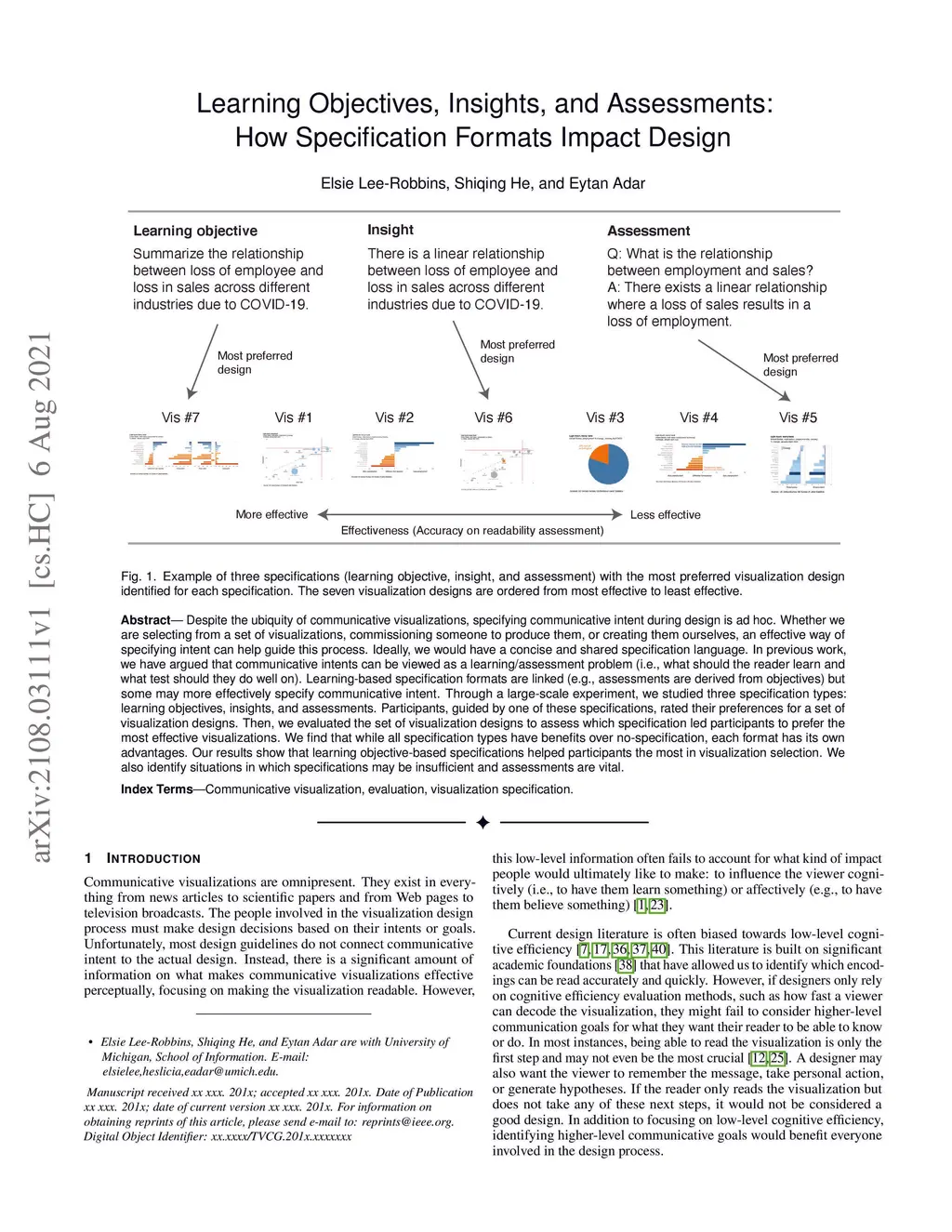 Despite the ubiquity of communicative visualizations, specifying communicative intent during design is ad hoc. Whether we are selecting from a set of visualizations, commissioning someone to produce them, or creating them ourselves, an effective way of specifying intent can help guide this process. Ideally, we would have a concise and shared specification language. In previous work, we have argued that communicative intents can be viewed as a learning/assessment problem (i.e., what should the reader learn and what test should they do well on). Learning-based specification formats are linked (e.g., assessments are derived from objectives) but some may more effectively specify communicative intent. Through a large-scale experiment, we studied three specification types: learning objectives, insights, and assessments. Participants, guided by one of these specifications, rated their preferences for a set of visualization designs. Then, we evaluated the set of visualization designs to assess which specification led participants to prefer the most effective visualizations. We find that while all specification types have benefits over no-specification, each format has its own advantages. Our results show that learning objective-based specifications helped participants the most in visualization selection. We also identify situations in which specifications may be insufficient and assessments are vital.