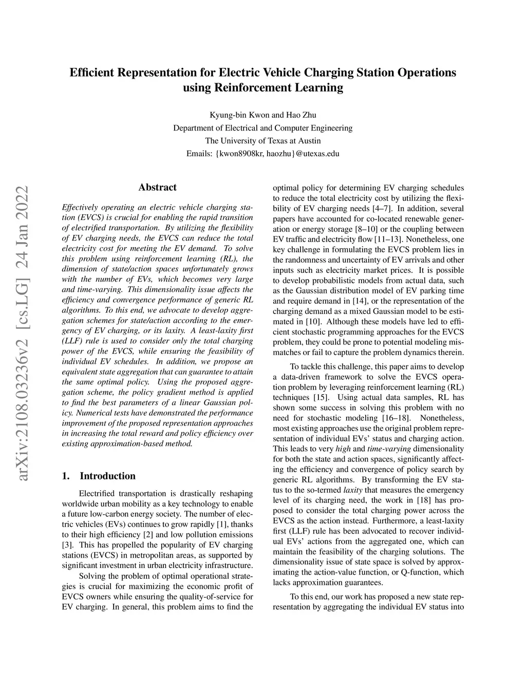 Effectively operating electrical vehicle charging station (EVCS) is crucial for enabling the rapid transition of electrified transportation. To solve this problem using reinforcement learning (RL), the dimension of state/action spaces scales with the number of EVs and is thus very large and time-varying. This dimensionality issue affects the efficiency and convergence properties of generic RL algorithms. We develop aggregation schemes that are based on the emergency of EV charging, namely the laxity value. A least-laxity first (LLF) rule is adopted to consider only the total charging power of the EVCS which ensures the feasibility of individual EV schedules. In addition, we propose an equivalent state aggregation that can guarantee to attain the same optimal policy. Based on the proposed representation, policy gradient method is used to find the best parameters for the linear Gaussian policy . Numerical results have validated the performance improvement of the proposed representation approaches in attaining higher rewards and more effective policies as compared to existing approximation based approach.