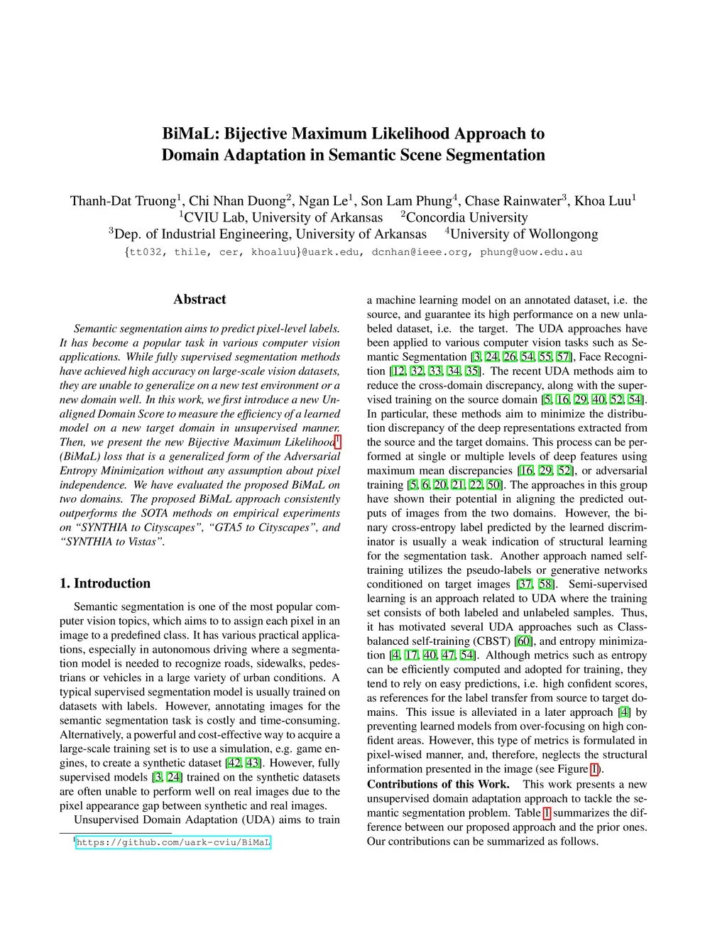 Semantic segmentation aims to predict pixel-level labels. It has become a popular task in various computer vision applications. While fully supervised segmentation methods have achieved high accuracy on large-scale vision datasets, they are unable to generalize on a new test environment or a new domain well. In this work, we first introduce a new Un-aligned Domain Score to measure the efficiency of a learned model on a new target domain in unsupervised manner. Then, we present the new Bijective Maximum Likelihood(BiMaL) loss that is a generalized form of the Adversarial Entropy Minimization without any assumption about pixel independence. We have evaluated the proposed BiMaL on two domains. The proposed BiMaL approach consistently outperforms the SOTA methods on empirical experiments on "SYNTHIA to Cityscapes", "GTA5 to Cityscapes", and "SYNTHIA to Vistas".