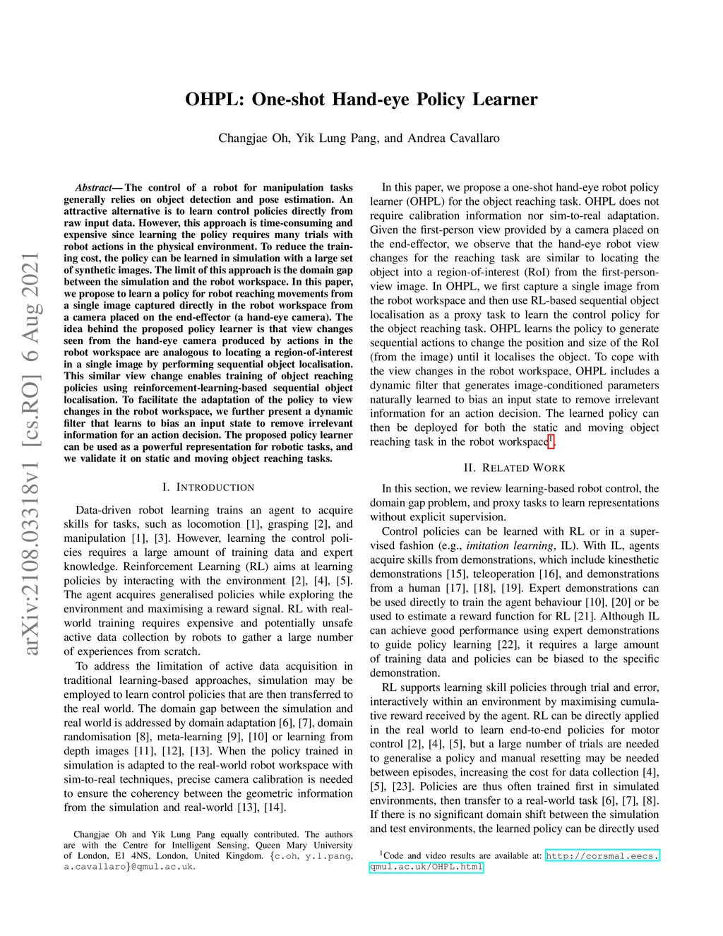 OHPL: One-shot Hand-eye Policy Learner