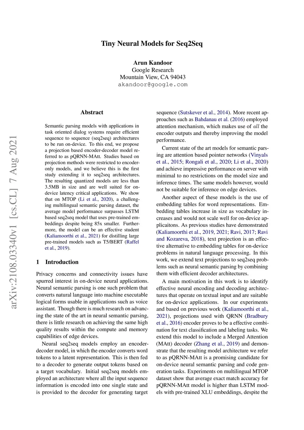 Semantic parsing models with applications in task oriented dialog systems require efficient sequence to sequence (seq2seq) architectures to be run on-device. To this end, we propose a projection based encoder-decoder model referred to as pQRNN-MAtt. Studies based on projection methods were restricted to encoder-only models, and we believe this is the first study extending it to seq2seq architectures. The resulting quantized models are less than 3.5MB in size and are well suited for on-device latency critical applications. We show that on MTOP, a challenging multilingual semantic parsing dataset, the average model performance surpasses LSTM based seq2seq model that uses pre-trained embeddings despite being 85x smaller. Furthermore, the model can be an effective student for distilling large pre-trained models such as T5/BERT.