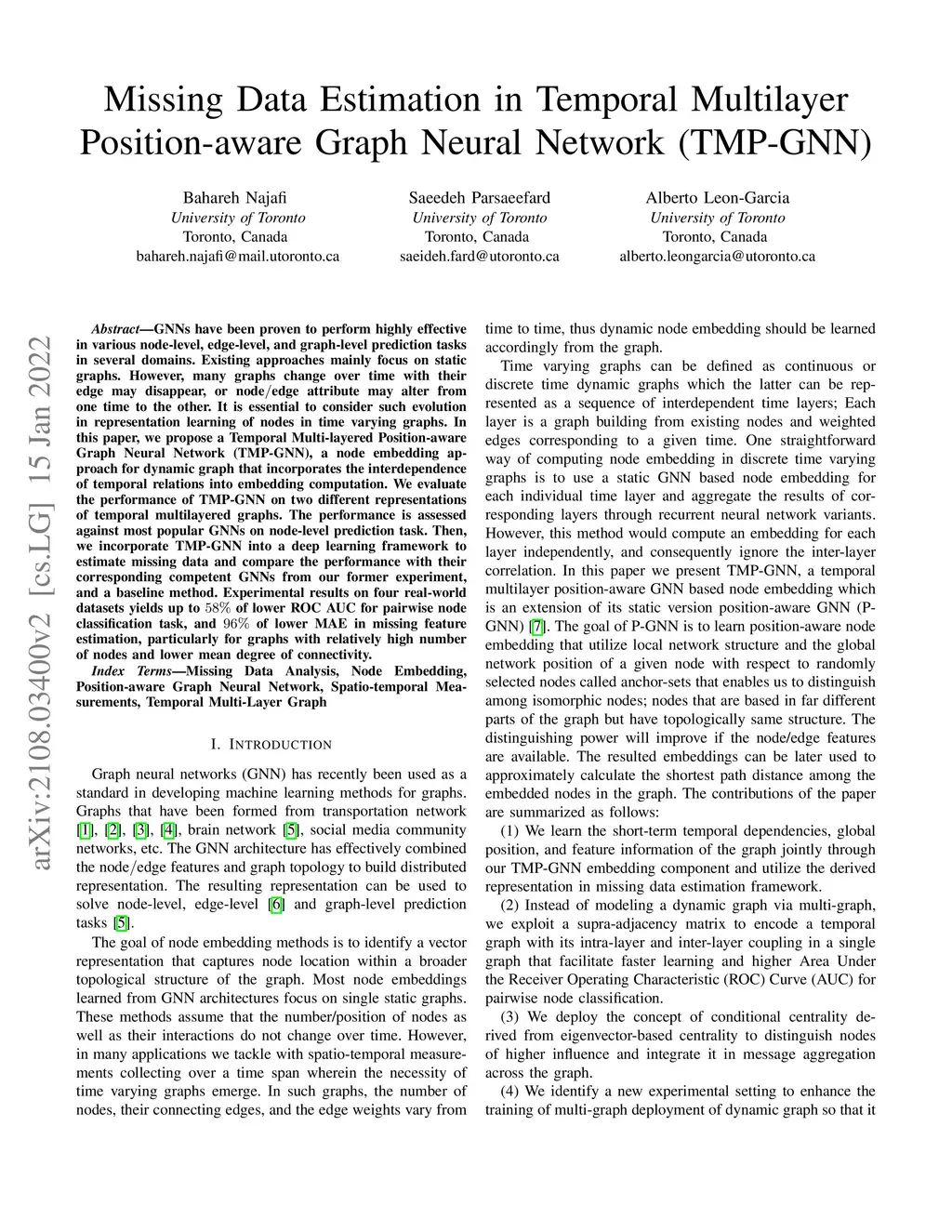 GNNs have been proven to perform highly effective in various node-level, edge-level, and graph-level prediction tasks in several domains. Existing approaches mainly focus on static graphs. However, many graphs change over time with their edge may disappear, or node/edge attribute may alter from one time to the other. It is essential to consider such evolution in representation learning of nodes in time varying graphs. In this paper, we propose a Temporal Multi-layered Position-aware Graph Neural Network (TMP-GNN), a node embedding approach for dynamic graph that incorporates the interdependence of temporal relations into embedding computation. We evaluate the performance of TMP-GNN on two different representations of temporal multilayered graphs. The performance is assessed against the most popular GNNs on node-level prediction tasks. Then, we incorporate TMP-GNN into a deep learning framework to estimate missing data and compare the performance with their corresponding competent GNNs from our former experiment, and a baseline method. Experimental results on four real-world datasets yield up to 58% of lower ROC AUC for pairwise node classification task, and 96% of lower MAE in missing feature estimation, particularly for graphs with a relatively high number of nodes and lower mean degree of connectivity.