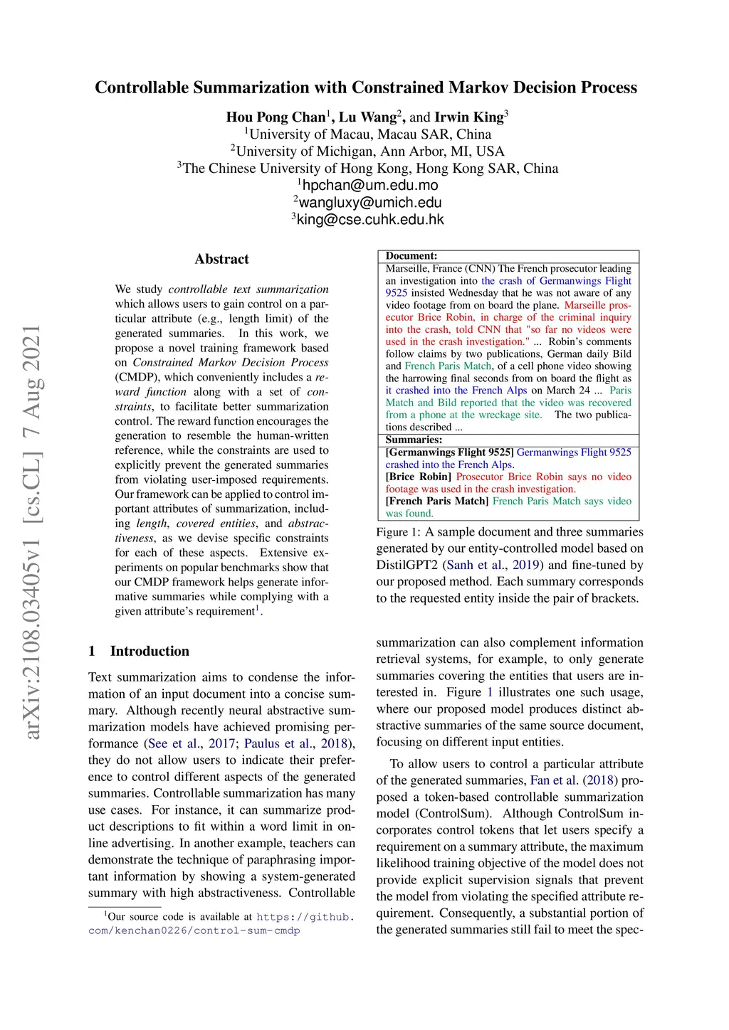 We study controllable text summarization which allows users to gain control on a particular attribute (e.g., length limit) of the generated summaries. In this work, we propose a novel training framework based on Constrained Markov Decision Process (CMDP), which conveniently includes a reward function along with a set of constraints, to facilitate better summarization control. The reward function encourages the generation to resemble the human-written reference, while the constraints are used to explicitly prevent the generated summaries from violating user-imposed requirements. Our framework can be applied to control important attributes of summarization, including length, covered entities, and abstractiveness, as we devise specific constraints for each of these aspects. Extensive experiments on popular benchmarks show that our CMDP framework helps generate informative summaries while complying with a given attribute's requirement.