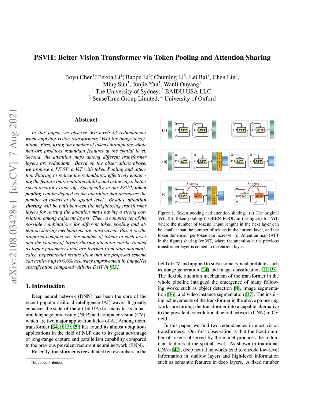 PSViT: Better Vision Transformer via Token Pooling and Attention Sharing