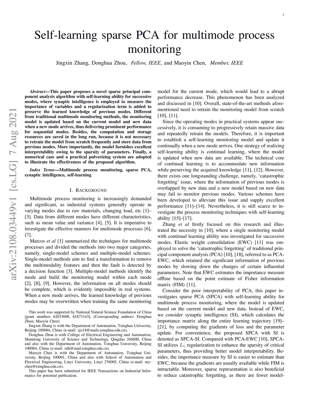 This paper proposes a novel sparse principal component analysis algorithm with self-learning ability for successive modes, where synaptic intelligence is employed to measure the importance of variables and a regularization term is added to preserve the learned knowledge of previous modes. Different from traditional multimode monitoring methods, the monitoring model is updated based on the current model and new data when a new mode arrives, thus delivering prominent performance for sequential modes. Besides, the computation and storage resources are saved in the long run, because it is not necessary to retrain the model from scratch frequently and store data from previous modes. More importantly, the model furnishes excellent interpretability owing to the sparsity of parameters. Finally, a numerical case and a practical pulverizing system are adopted to illustrate the effectiveness of the proposed algorithm.