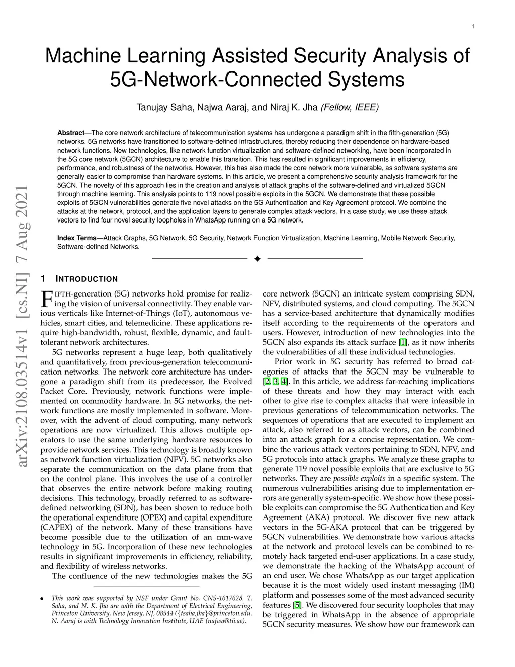 The core network architecture of telecommunication systems has undergone a paradigm shift in the fifth-generation (5G)networks. 5G networks have transitioned to software-defined infrastructures, thereby reducing their dependence on hardware-based network functions. New technologies, like network function virtualization and software-defined networking, have been incorporated in the 5G core network (5GCN) architecture to enable this transition. This has resulted in significant improvements in efficiency, performance, and robustness of the networks. However, this has also made the core network more vulnerable, as software systems are generally easier to compromise than hardware systems. In this article, we present a comprehensive security analysis framework for the 5GCN. The novelty of this approach lies in the creation and analysis of attack graphs of the software-defined and virtualized 5GCN through machine learning. This analysis points to 119 novel possible exploits in the 5GCN. We demonstrate that these possible exploits of 5GCN vulnerabilities generate five novel attacks on the 5G Authentication and Key Agreement protocol. We combine the attacks at the network, protocol, and the application layers to generate complex attack vectors. In a case study, we use these attack vectors to find four novel security loopholes in WhatsApp running on a 5G network.