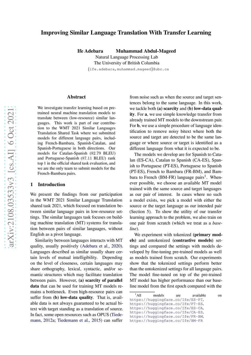 We investigate transfer learning based on pre-trained neural machine translation models to translate between (low-resource) similar languages. This work is part of our contribution to the WMT 2021 Similar Languages Translation Shared Task where we submitted models for different language pairs, including French-Bambara, Spanish-Catalan, and Spanish-Portuguese in both directions. Our models for Catalan-Spanish ( BLEU) and Portuguese-Spanish ( BLEU) rank top 1 in the official shared task evaluation, and we are the only team to submit models for the French-Bambara pairs.
