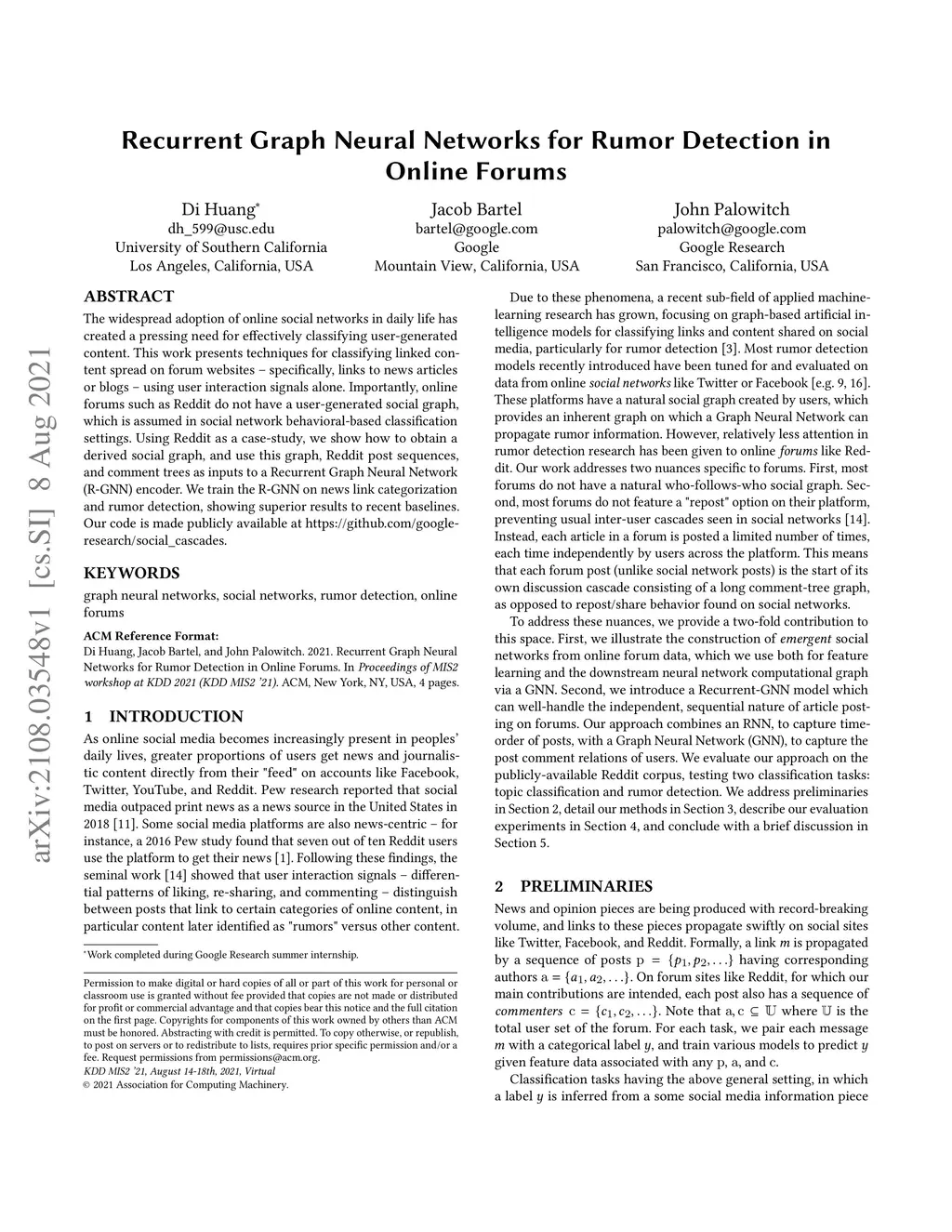 Recurrent Graph Neural Networks for Rumor Detection in Online Forums