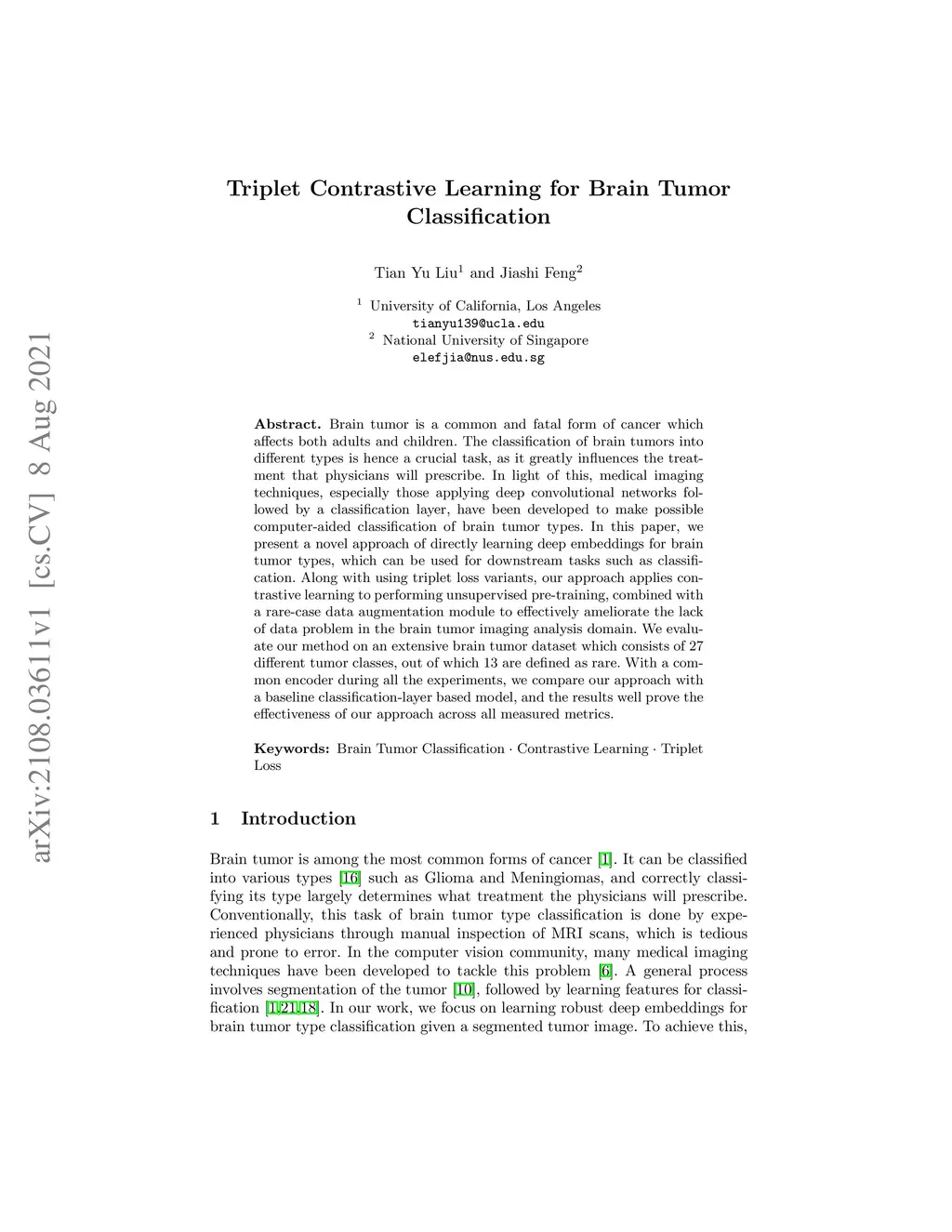 Brain tumor is a common and fatal form of cancer which affects both adults and children. The classification of brain tumors into different types is hence a crucial task, as it greatly influences the treatment that physicians will prescribe. In light of this, medical imaging techniques, especially those applying deep convolutional networks followed by a classification layer, have been developed to make possible computer-aided classification of brain tumor types. In this paper, we present a novel approach of directly learning deep embeddings for brain tumor types, which can be used for downstream tasks such as classification. Along with using triplet loss variants, our approach applies contrastive learning to performing unsupervised pre-training, combined with a rare-case data augmentation module to effectively ameliorate the lack of data problem in the brain tumor imaging analysis domain. We evaluate our method on an extensive brain tumor dataset which consists of 27 different tumor classes, out of which 13 are defined as rare. With a common encoder during all the experiments, we compare our approach with a baseline classification-layer based model, and the results well prove the effectiveness of our approach across all measured metrics.